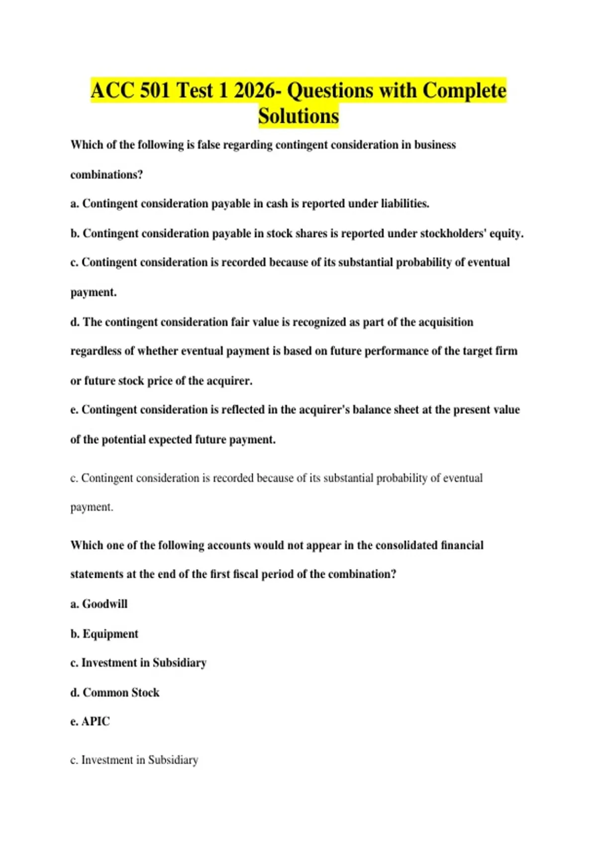 c. Contingent consideration is recorded because of its substantial probability of eventual