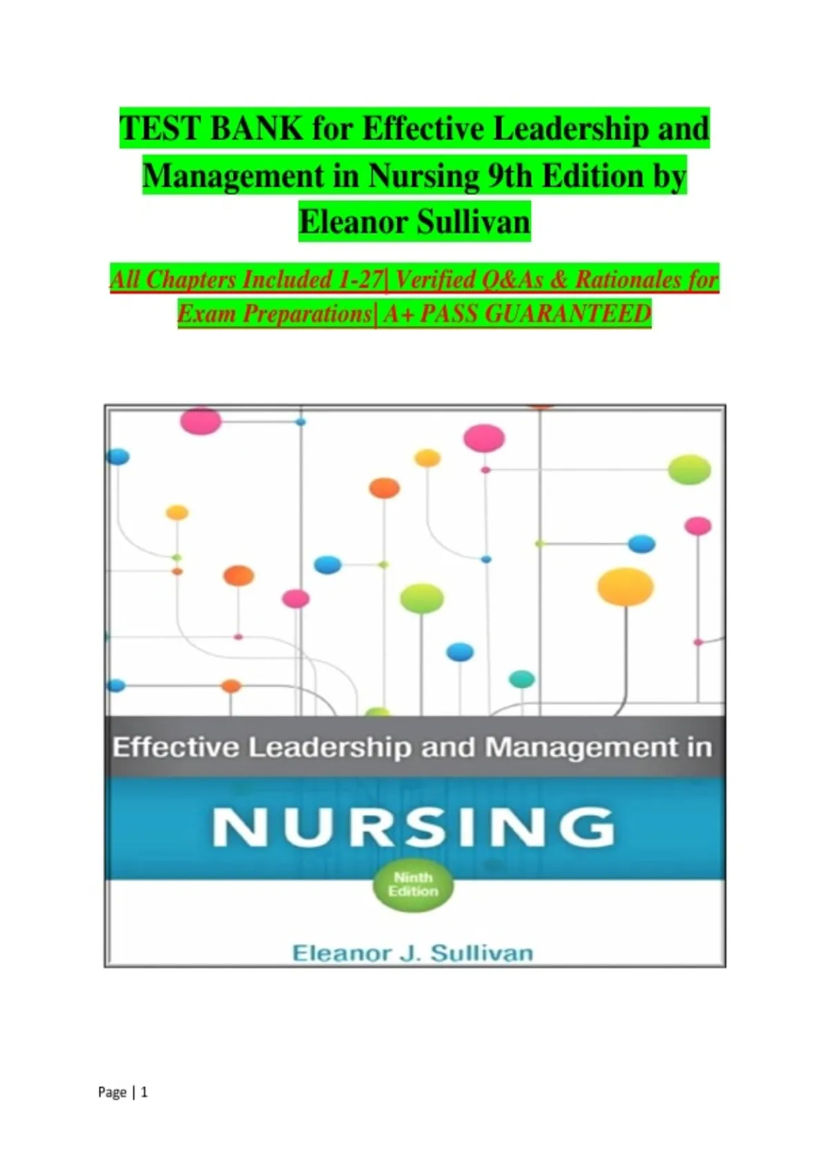 Prepare effectively for nursing leadership and management exams with this comprehensive Test Bank for Effective Leadership and Management in Nursing, 9th Edition by Eleanor. Includes practice questions, verified answers, and rationales covering leadership theories, team management, delegation, communication, decision-making, conflict resolution, and organizational strategies. Perfect for nursing students, nurse managers, and instructors seeking structured review, exam prep, and confidence in mastering nursing leadership and management concepts. Ideal for homework help, quizzes, and final exam preparation.
