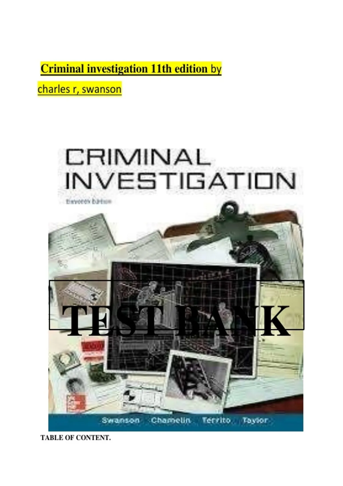This document supports Criminal Investigation, 11th Edition by Charles R. Swanson and covers core principles and methods used in modern criminal investigations. It addresses key topics such as investigative procedures, evidence collection, interviewing, and case analysis, making it useful for criminal justice students and exam preparation.