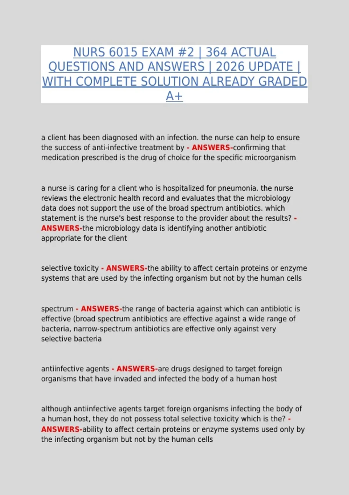 This NURS 6015 Exam 2 | Complete Question Bank with 364 Fully Solved Answers (2026 Update, A+) is an extensive and reliable study resource designed to help nursing students prepare thoroughly for Exam 2. The document features all 364 actual exam questions paired with verified correct answers and detailed explanations, making it an essential tool for revision, self-assessment, and exam readiness. The content is fully aligned with current nursing curriculum standards and updated for 2026 coursework, covering critical topics such as advanced nursing concepts, clinical decision-making, patient care strategies, and evidence-based practice. Each question and solution is structured to enhance understanding, reinforce critical thinking, and support confident application in real-world clinical scenarios.