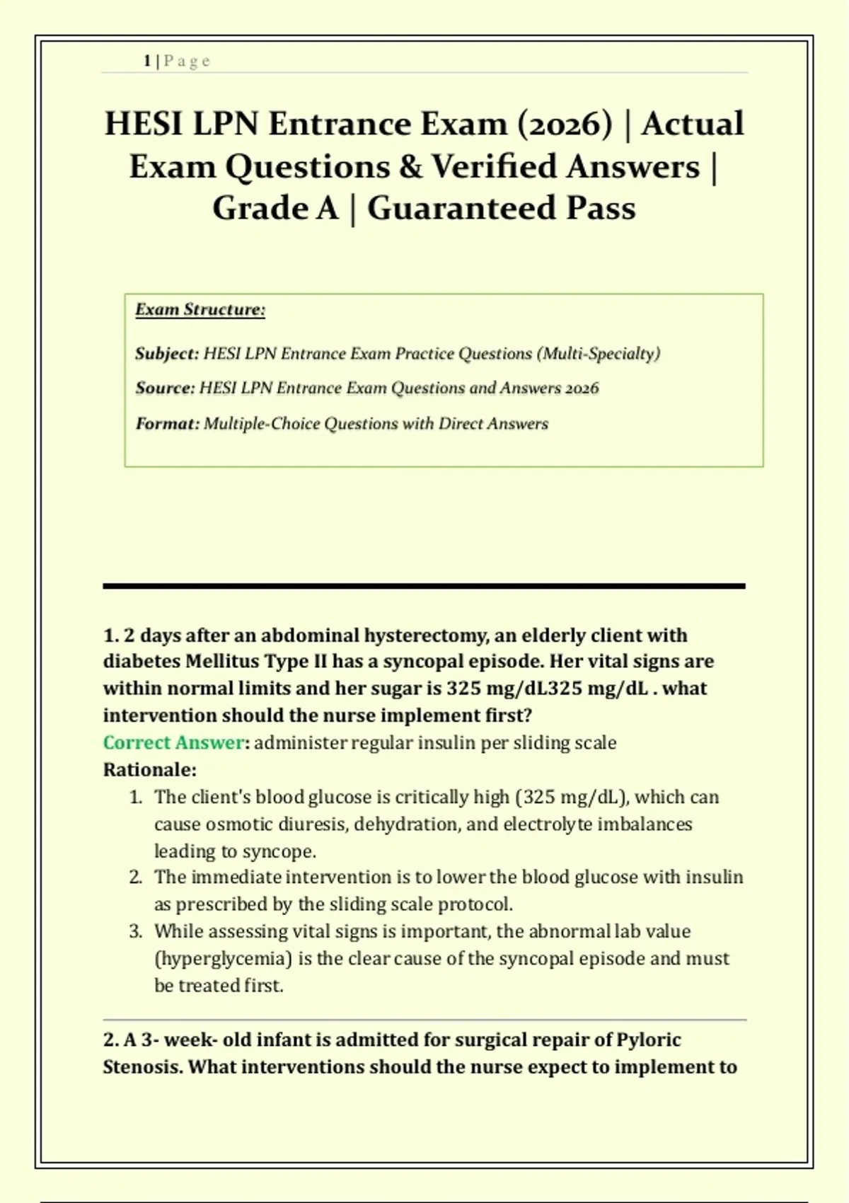 Subject: HESI LPN Entrance Exam Practice Questions (Multi-Specialty)