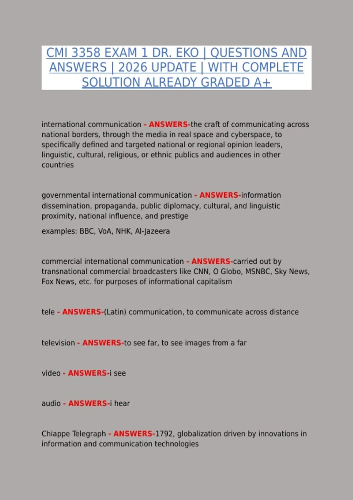 This CMI 3358 Exam 1 | Fully Solved Questions with Detailed Solutions (2026 Update, A+) is a complete study resource designed to help students prepare effectively for Exam 1 under Dr. Eko. The document features carefully selected questions paired with fully verified answers and detailed explanations, making it an essential tool for exam preparation, revision, and self-assessment. The content is aligned with current course objectives and updated for 2026 standards, covering critical topics relevant to CMI 3358, including core concepts, practical applications, and problem-solving strategies. Each question and solution is organized to enhance understanding, reinforce critical thinking, and support confident performance in exams.