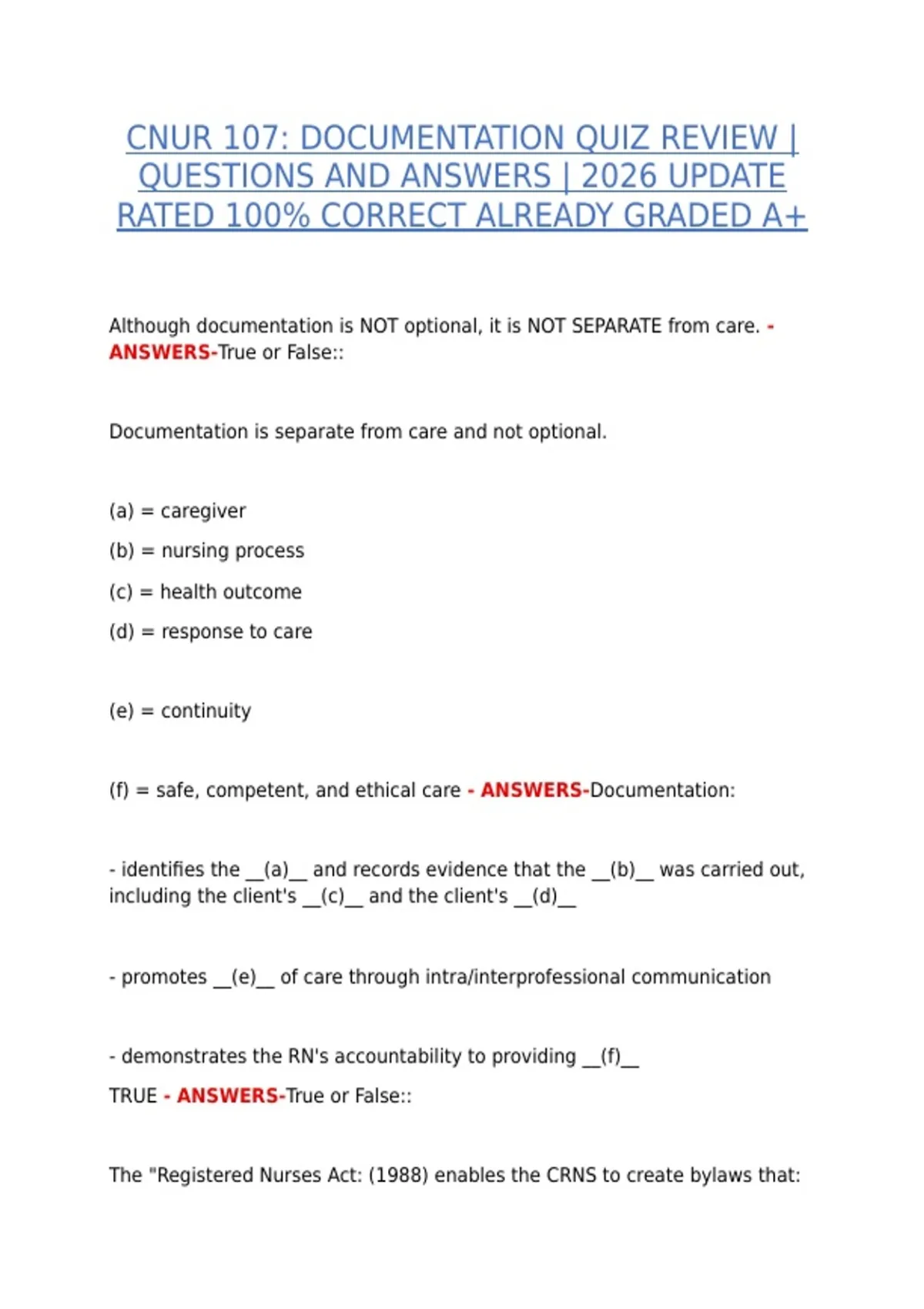 CNUR 107 – Documentation Quiz Review | 2026 Edition Prepare for your CNUR 107 documentation quiz with fully verified questions and answers. Updated for 2026 coursework, this guide covers accurate patient documentation, charting techniques, legal considerations, and electronic health records. Each question includes detailed explanations to help you understand, review, and excel. Rated 100% correct and graded A+, it’s the ideal resource for quick revision, exam prep, and self-assessment.