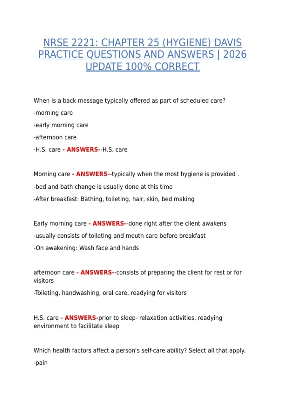 Early morning care - ANSWERS--done right after the client awakens