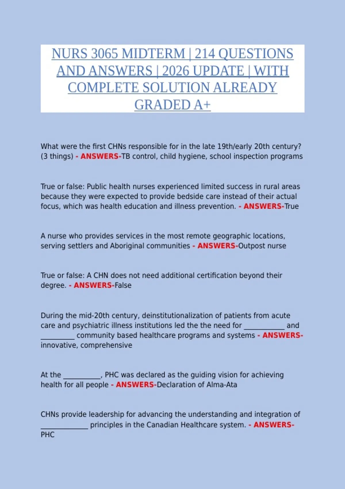 This NURS 3065 – Midterm Exam | 214 Questions with Complete Verified Answers (2026 Edition, A+) is a comprehensive study resource designed to help nursing students prepare thoroughly for their midterm exam. The document features 214 carefully selected questions paired with verified correct answers and detailed explanations, making it an essential tool for exam preparation, revision, and self-assessment. The content aligns with current nursing curriculum standards and is updated for 2026 coursework, covering critical topics such as patient care principles, clinical reasoning, nursing interventions, pharmacology basics, and foundational nursing skills. Each question and solution is structured to enhance understanding, reinforce critical thinking, and support confident performance in both exams and clinical practice.