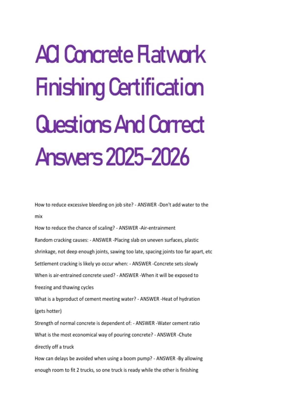 ACI - Concrete Strength Technician Training Exam Questions with 100% Correct Verified Answers . Materials that can be used to cap hardened cement concrete cylinders. - ANSWER -Neat Portland Cement, Gypsum Cement, Sulfur T/F Plaster of paris is an example of a high-strength plaster - ANSWER -False Sulfur and gypsum cubes much show this compressive strength or the cylinder strength, whichever is greater. - ANSWER -5000 psi Strength of the paste depends on___, ___, and___. - ANSWER -Water cement ratio, time, type of cement These are avoided when a slight twisting motion is applied while capping. - ANSWER -Air voids and excess paste Sulfur material should not be used more than ___ times. - ANSWER -5 T/F When capping concrete cylinders with a compressive strength of 5000 psi or greater, it is permitted to reuse compound recovered from the capping operation of old caps. - ANSWER -False Sulfur mortar should be kept away from this while heating. - ANSWER -Water Sulfur mortar should be kept under a ___ with an___ for venting. - ANSWER Hood, exhaust Standard Practice for use of unbonded caps in determination of compressive strength of hardened concrete cylinders. - ANSWER -ASTM C1231 Thickness of pads (C1231) in Inches - ANSWER -1/2 Durometer used in C1231 with a tolerance of +/-5. - ANSWER -Shore A Type of pad with classifications in C1231. - ANSWER -Neoprene Height of the retaining ring used in unbonded capping. in inches - ANSWER -1 The inside diameter of the retaining ring shall be within ___ of the diameter of the cylinder. - ANSWER -102-107% Thickness of the retaining ring for 6 in and 4 in specimens respectively. - ANSWER -12 mm, 9 mm The bearing surfaces shall not have gouges or grooves greater than this depth. (mm) - ANSWER -0.25 Cylinders should be made in accordance with one of these procedures. - ANSWER -C31 or C192 Depressions in the concrete cylinder shall not exceed___in., with grinding, sawing or capping being the correction. - ANSWER -0.20 When tests are made to establish a permissible number of reuses, the tests within ___ of the highest strength level will be included in the reuse count. - ANSWER 2000 psi Qualification tests of unbonded caps are to be performed by___. - ANSWER Supplier/tester T/F C1231 establishes a maximum number of pad reuses that may not be exceeded under any circumstances. - ANSWER -False Psi range in which unbonded caps can be used. - ANSWER -1500-12,000 T/F Polyurthane or butyl pads with a hardness of 50 that will be used on concrete with a compressive strength of psi need not be qualified prior to use. - ANSWER -False T/F If a new neoprene pad this a Shore A durometer hardness of 50 is intended to test concrete cylinders with anticipated compressive strengths between psi, it may be used "as is" from the manufacturer without further qualification testing. - ANSWER -True The combination of a metal retainer and an elastomeric pad - ANSWER Unbonded cap