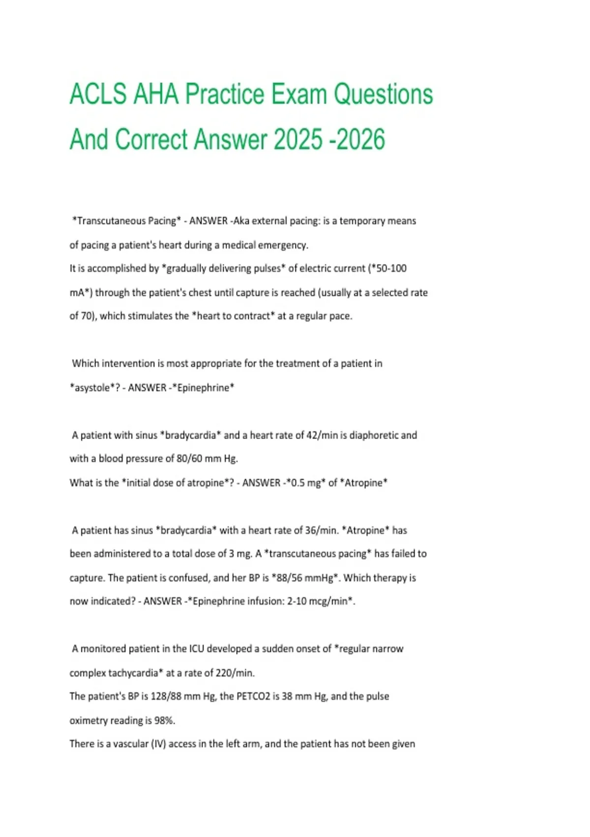 ACLS Post Test 1 (Latest 2025 ) Actual Questions and Correct Verified Answers. You are caring for a patient with a suspected stroke whose symptoms started 2 hours ago. The CT scan was normal, with no signs of hemorrhage. The patient does not have any contraindications to fibrinolytic therapy. Which treatment approach is best for this patient? - ANSWER -Start fibrinolytic therapy as soon as possible Which best describes this rhythm? - ANSWER -Third-degree atrioventricular block What is the recommended range from which a temperature should be selected and maintained constantly to achieve targeted management after cardiac arrest? - ANSWER -32 degrees celsius to 36 degrees celsius Which is the recommended first intravenous (IV) dose of amiodarone for a patient with refractory ventricular fibrillation? - ANSWER -300mg Which is the primary purpose of a medical emergency team or rapid response team? - ANSWER -Improving patient outcomes by identifying and treating early clinical deterioration Which is the recommended next step after a defibrillation attempt? - ANSWER Resume CPR, starting with chest compressions EMS providers are treating a patient with suspected stroke. According to the Adult Suspected Stroke Algorithm, which critical action performed by the EMS team will expedite this patient's care on arrival and reduce the time to treatment? - ANSWER -Alert the hospital A responder is caring for a patient with a history of congestive heart failure (CHF). The patient is experiencing shortness of breath, a blood pressure (BP) of 68/50 mmHg, and a heart rate of 190/min. The patient's lead II ECG is displayed here. Which best characterizes this patient's rhythm? - ANSWER -Unstable supraventricular tachycardia (SVT) Your rescue team arrives to find a 59-year-old man lying on the kitchen floor. You determine that he is unresponsive. Which is the next step in your assessment and management of this patient? - ANSWER -Check the patient's breathing and pulse Which best describes the length of time it should take to perform a pulse check during the BLS Assessment? - ANSWER -5 to 10 seconds You instruct a team member to give 0.5 mg atropine IV. Which response is an example of closed-loop communication? - ANSWER -"I'll draw up 0.5 mg of atropine." What is an effect of excessive ventilation? - ANSWER -Decreased cardiac output If a team member is about to make a mistake during a resuscitation attempt, which