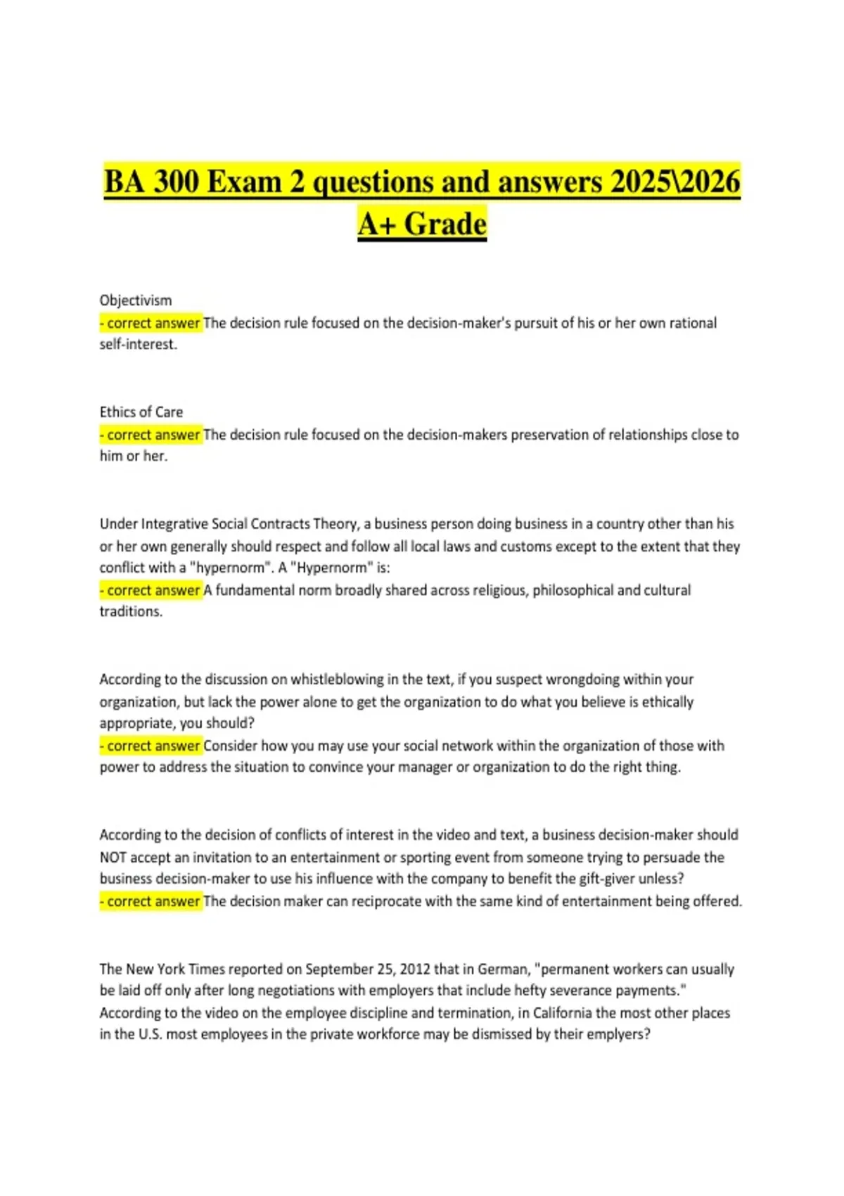 This study guide covers BA 300 Exam 2 content, focusing on intermediate business administration topics such as operations management, organizational strategy, financial analysis, marketing strategy, human resource management, business ethics, and decision-making frameworks. It includes exam-style questions with clear, accurate answers designed to support effective preparation for the 2025–2026 academic year. The material is structured to reinforce critical business concepts, enhance analytical skills, and help students achieve an A+ grade.