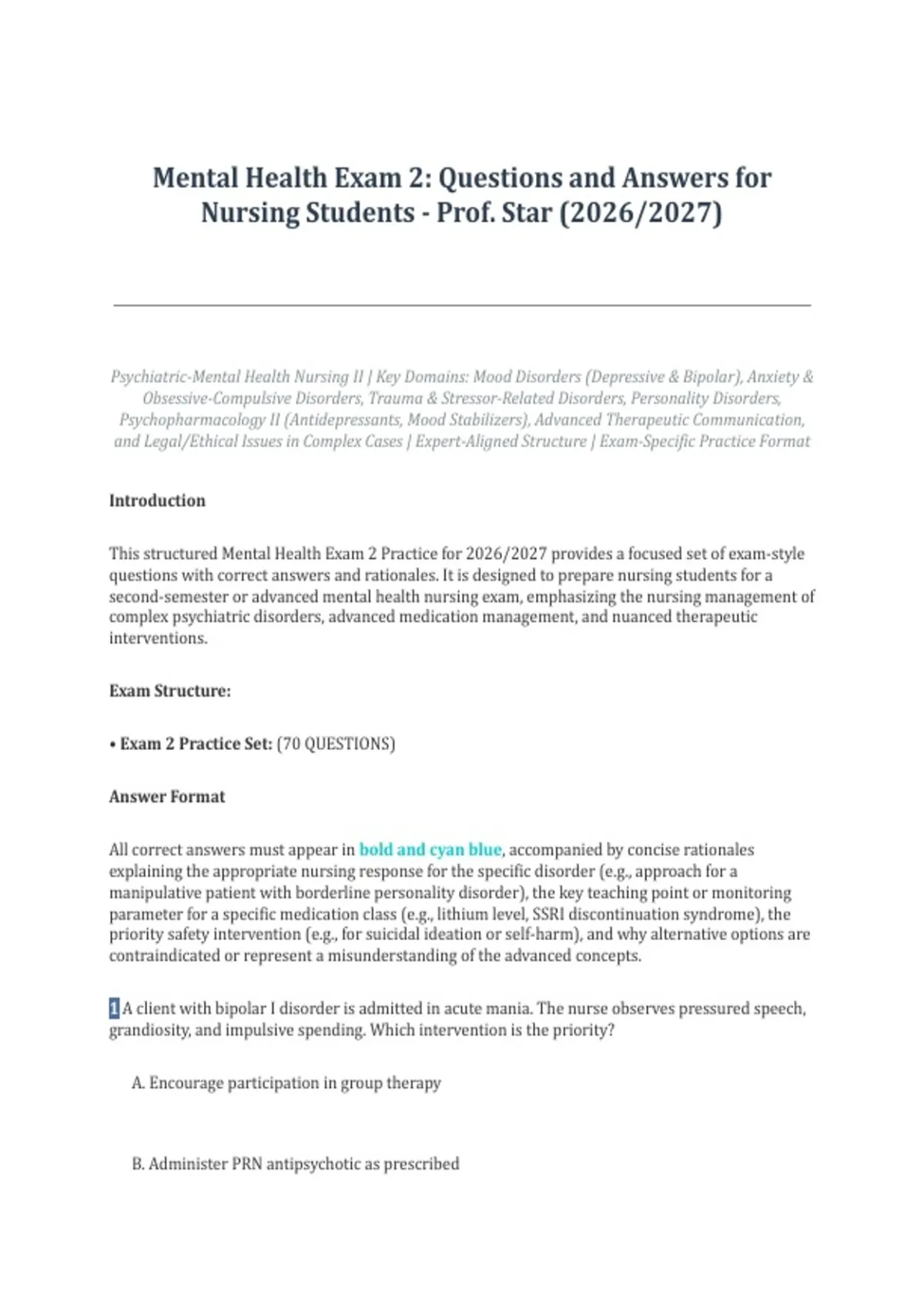 This structured Mental Health Exam 2 Practice for 2026/2027 provides a focused set of exam-style