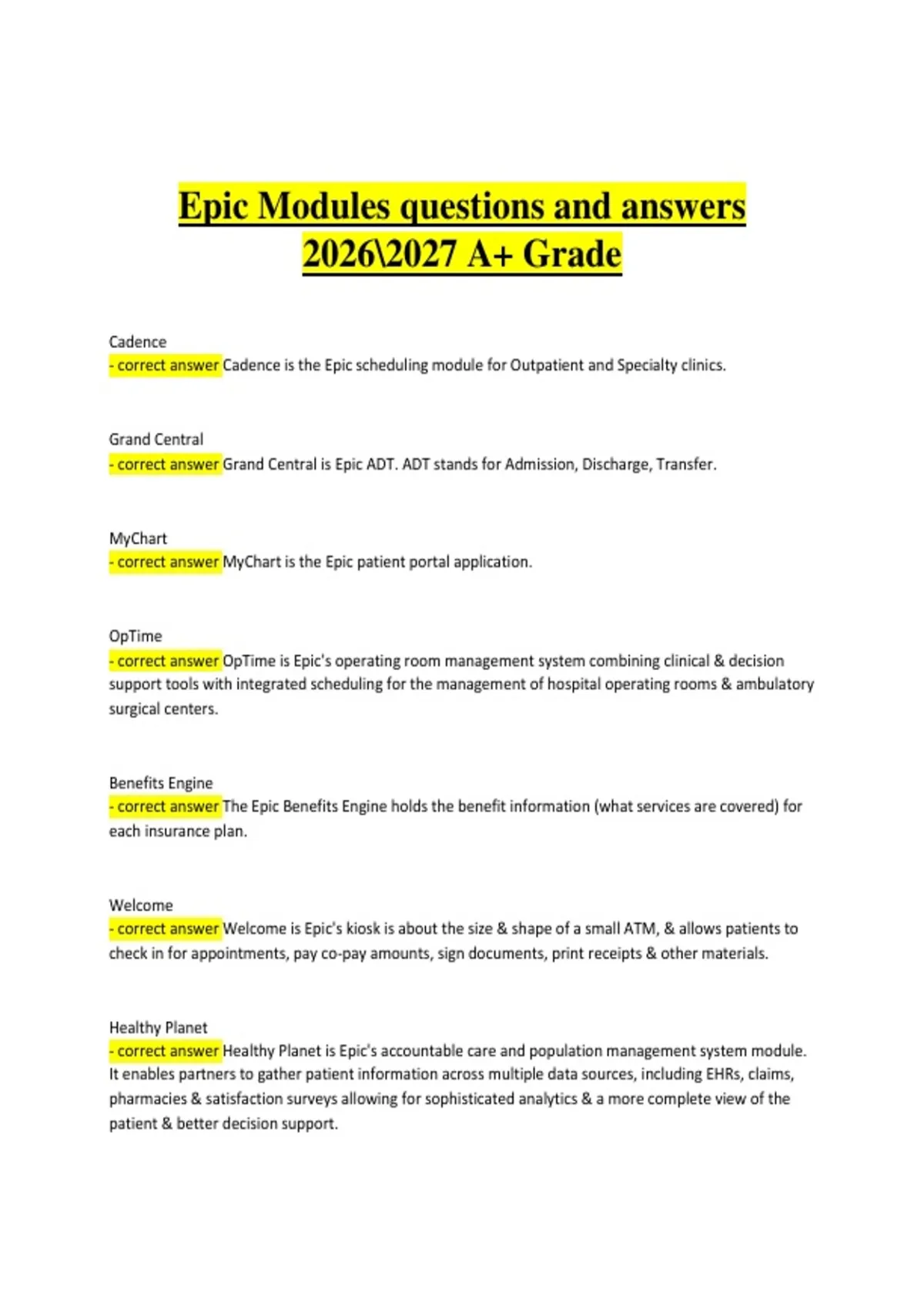 This study guide covers key Epic Modules, including electronic health record (EHR) navigation, clinical documentation, order entry, workflow optimization, reporting and analytics, clinical decision support, patient safety features, and compliance best practices. It includes module-aligned questions with verified, accurate answers designed to support focused preparation for Epic system assessments in the 2026–2027 period. The material is structured to reinforce practical Epic skills, improve informatics competency, and help candidates achieve an A+ grade.