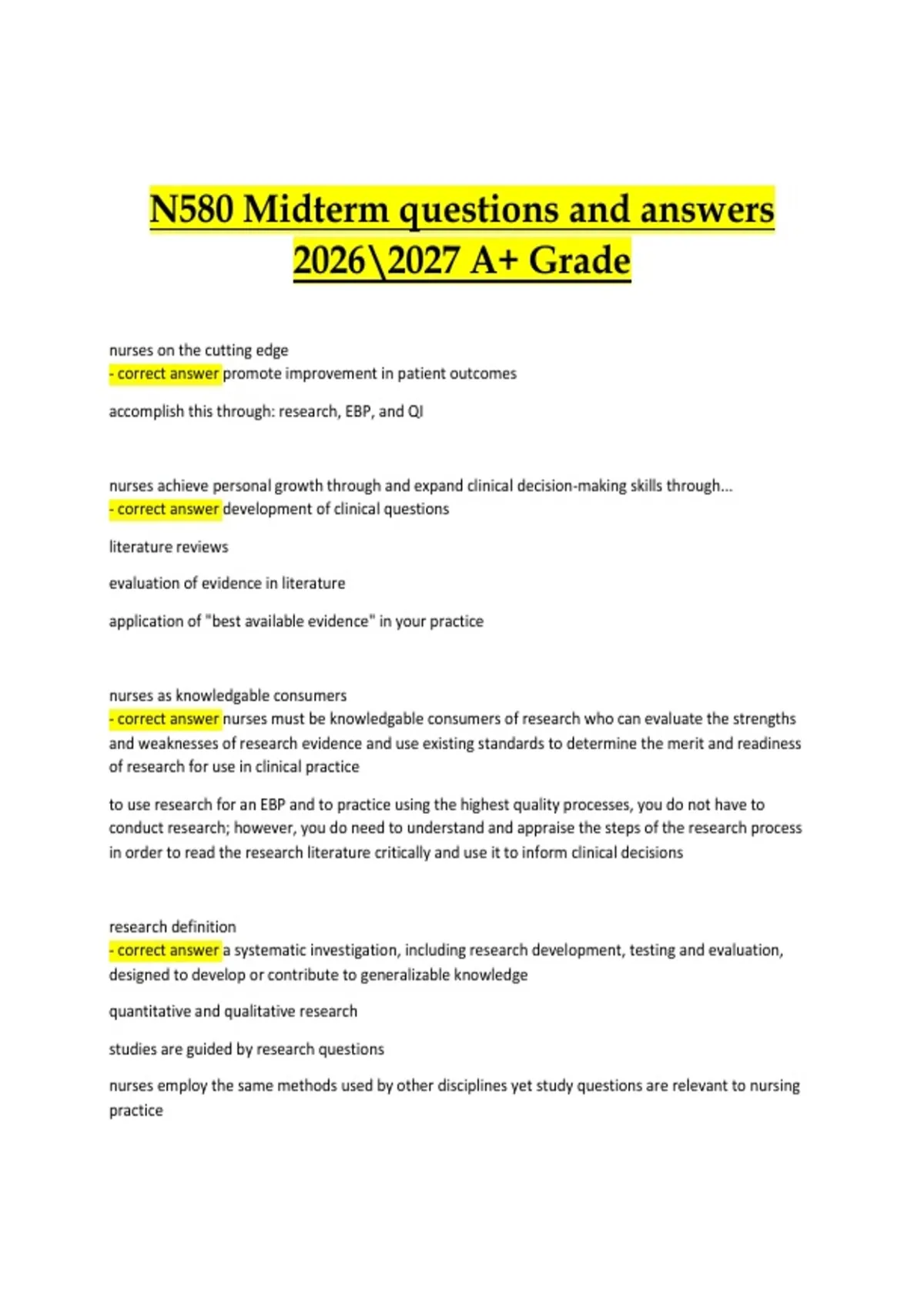 This study guide covers the N580 Midterm Exam, focusing on advanced nursing concepts such as health assessment, pathophysiology, pharmacology, clinical decision-making, patient management, evidence-based practice, and healthcare ethics. It includes exam-style questions with verified, accurate answers designed to support effective preparation for the 2026–2027 academic year. The material is structured to reinforce advanced nursing knowledge, critical thinking, and clinical reasoning, helping students achieve an A+ grade.