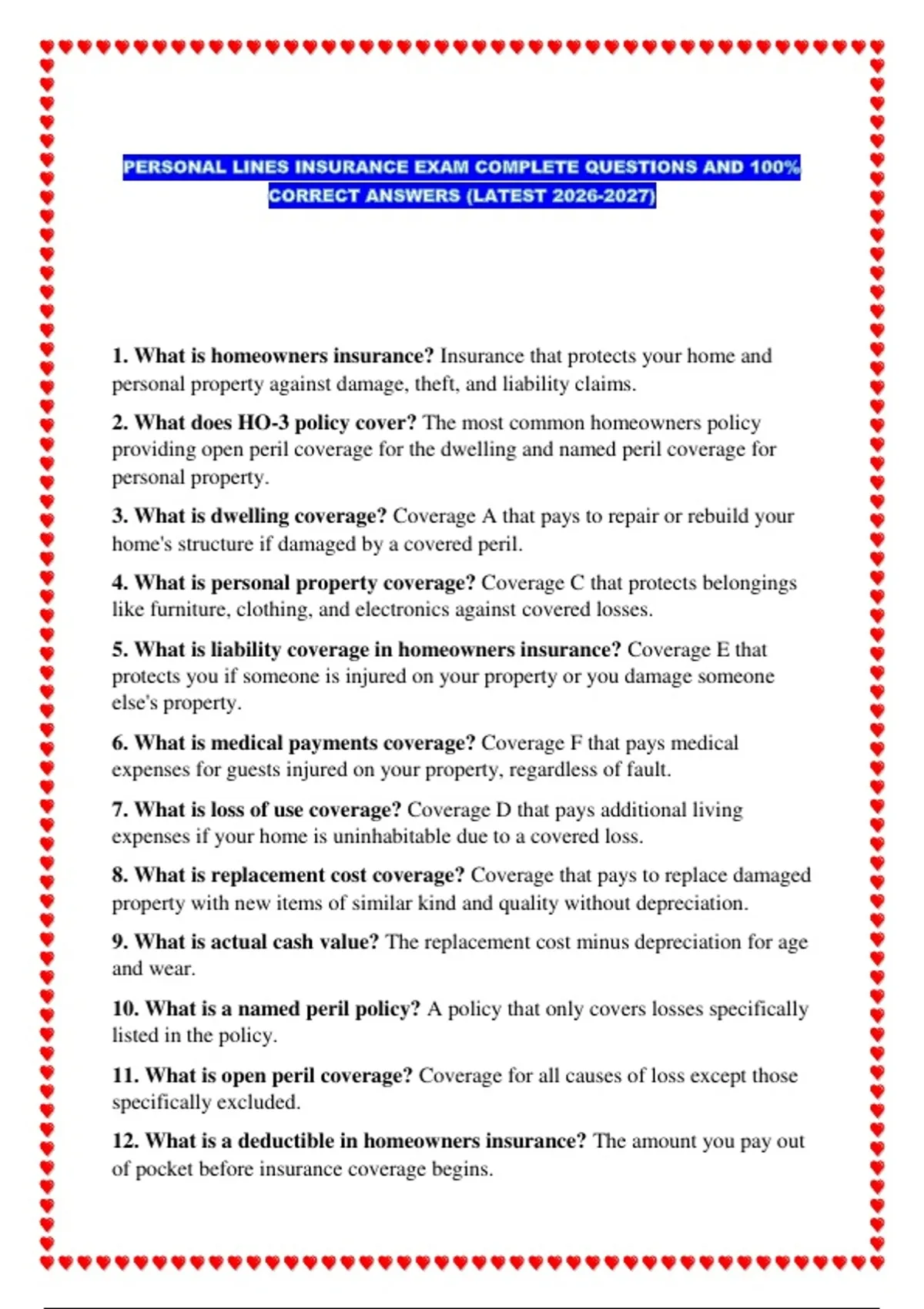 PERSONAL LINES INSURANCE EXAM COMPLETE QUESTIONS AND 100% CORRECT ANSWERS (LATEST )...