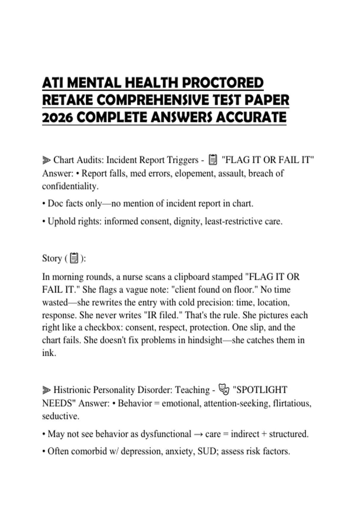 ATI MENTAL HEALTH PROCTORED RETAKE COMPREHENSIVE TEST PAPER 2026 COMPLETE ANSWERS ACCURATE