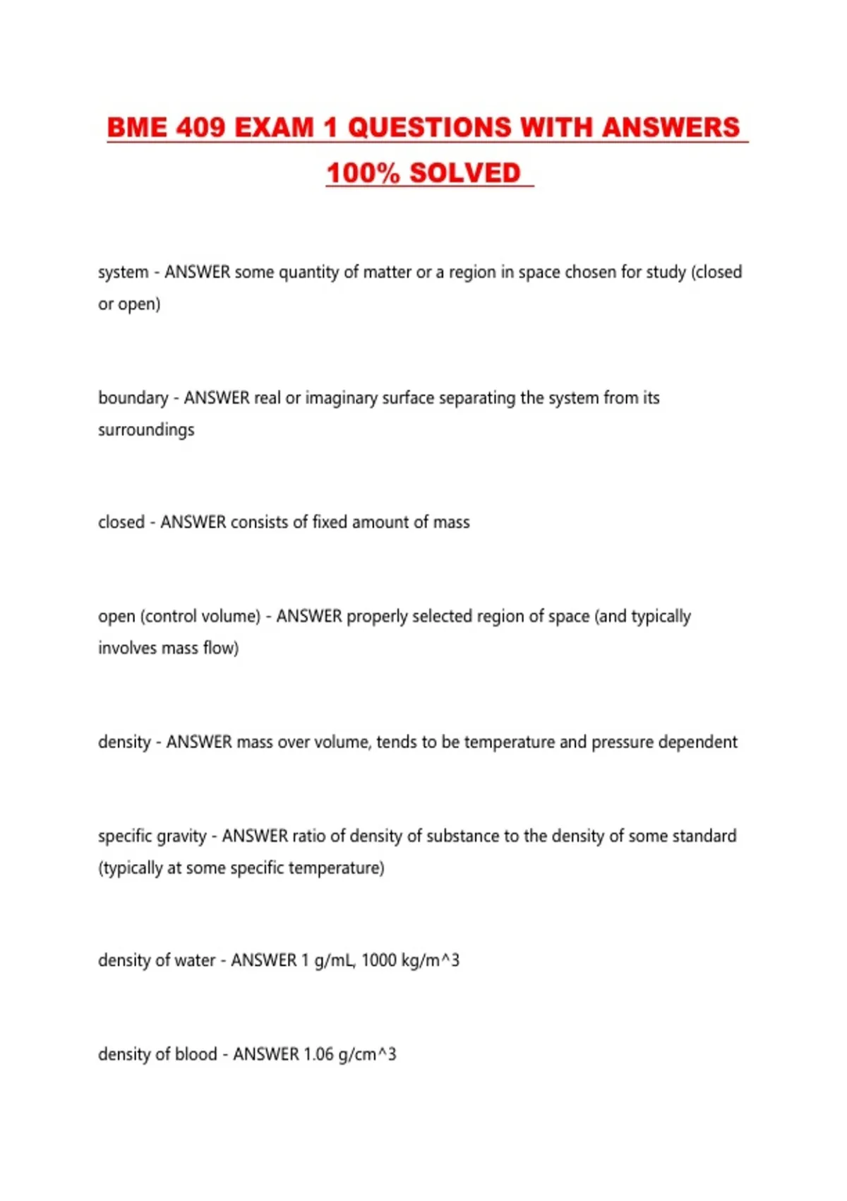 BME 409 EXAM 1 QUESTIONS WITH ANSWERS
