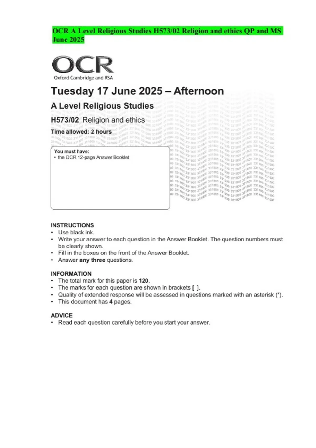OCR A Level Religious Studies H573/02 Religion and ethics QP and MS June 2025