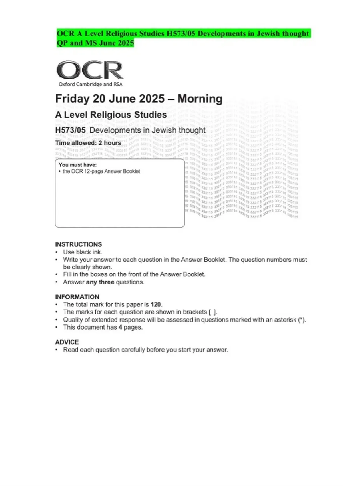 OCR A Level Religious Studies H573/05 Developments in Jewish thought QP and MS June 2025