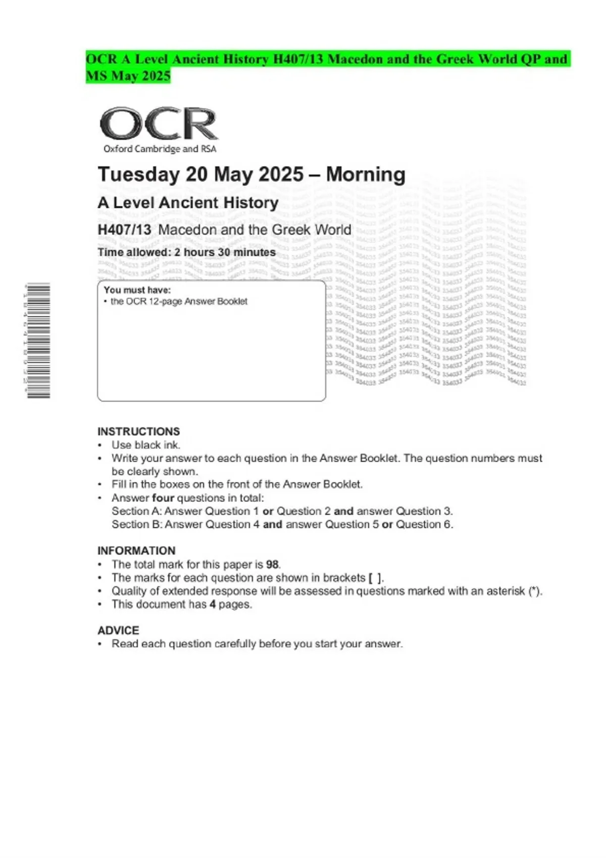 OCR A Level Ancient History H407/13 Macedon and the Greek World QP and MS May 2025