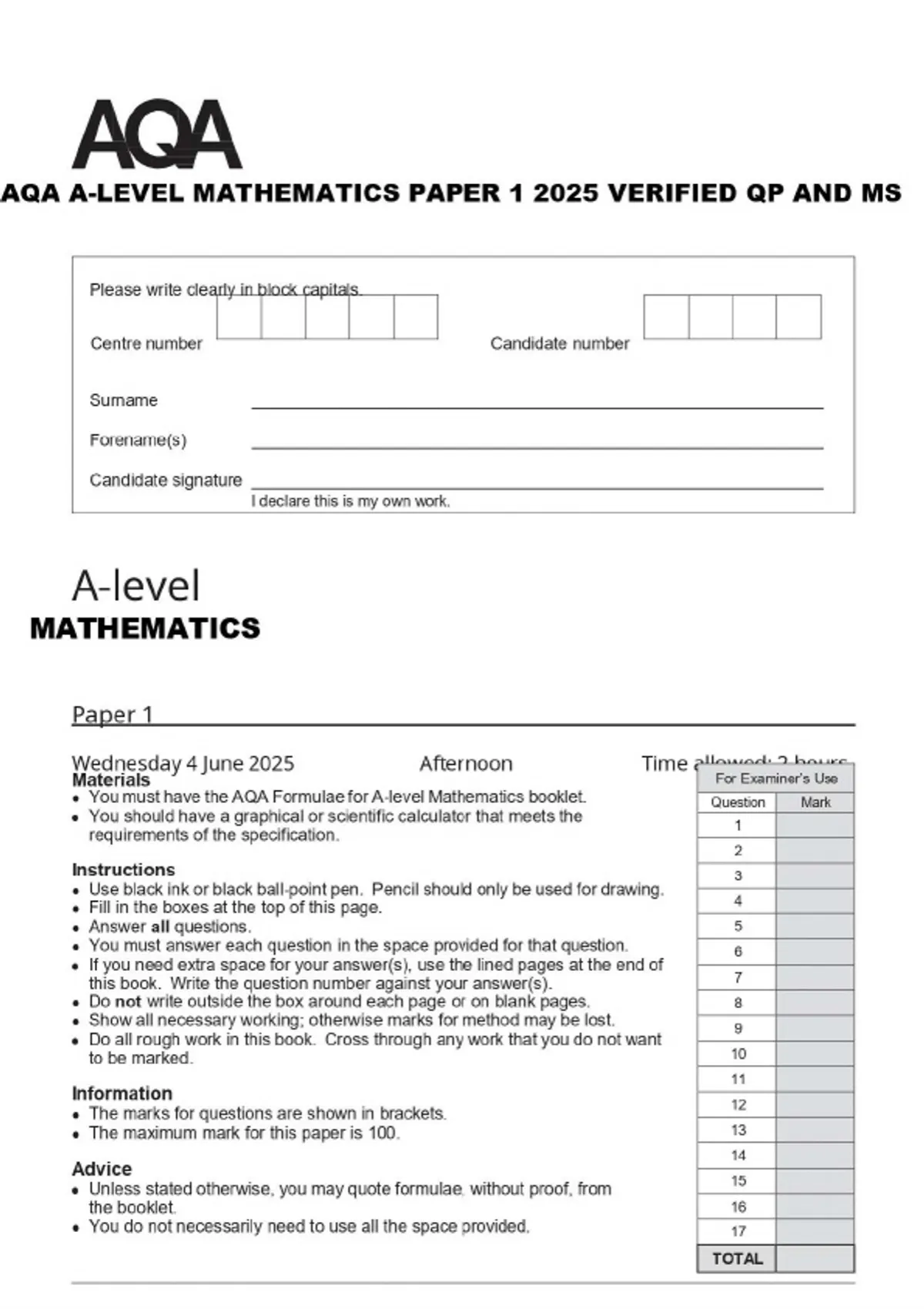 AQA A-LEVEL MATHEMATICS PAPER 1 2025 VERIFIED QP AND MS
