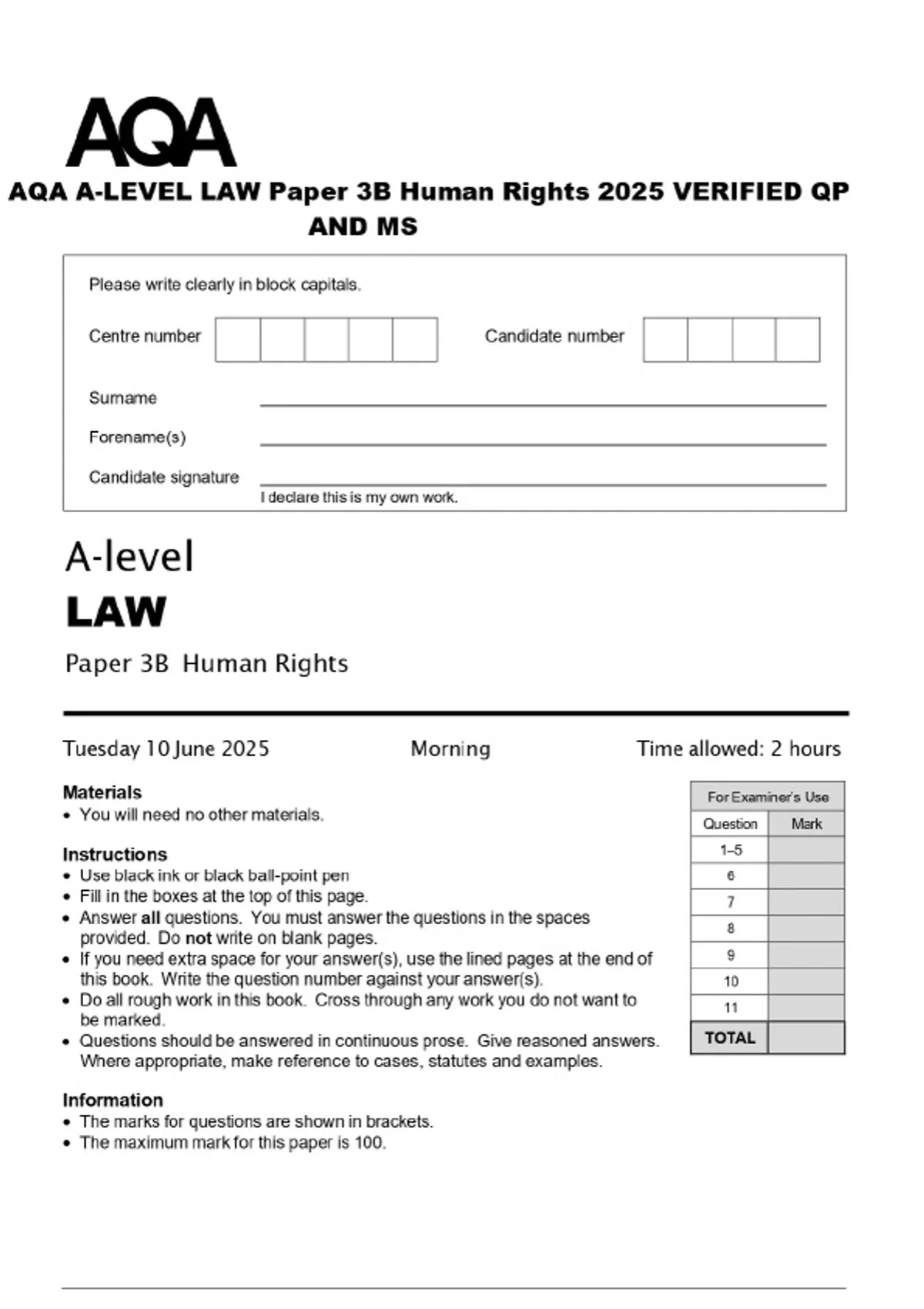 AQA A-LEVEL LAW Paper 3B Human Rights 2025 VERIFIED QP AND MS