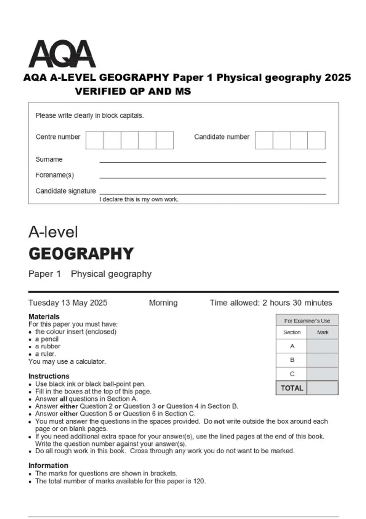 AQA A-LEVEL GEOGRAPHY Paper 1 Physical geography 2025 VERIFIED QP AND MS