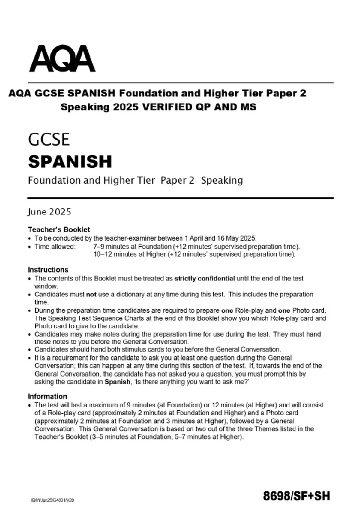 AQA GCSE SPANISH Foundation and Higher Tier Paper 2 Speaking 2025 VERIFIED QP AND MS
