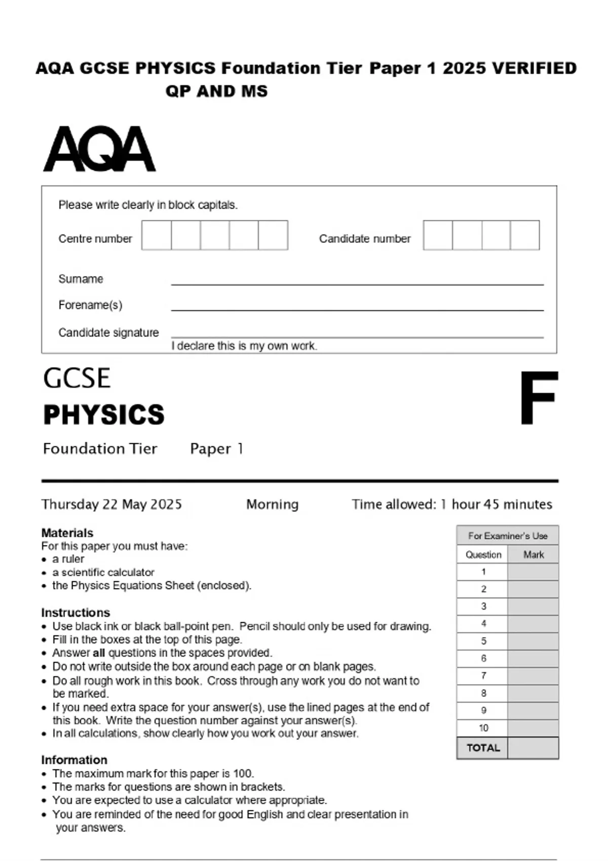 AQA GCSE PHYSICS Foundation Tier Paper 1 2025 VERIFIED QP AND MS