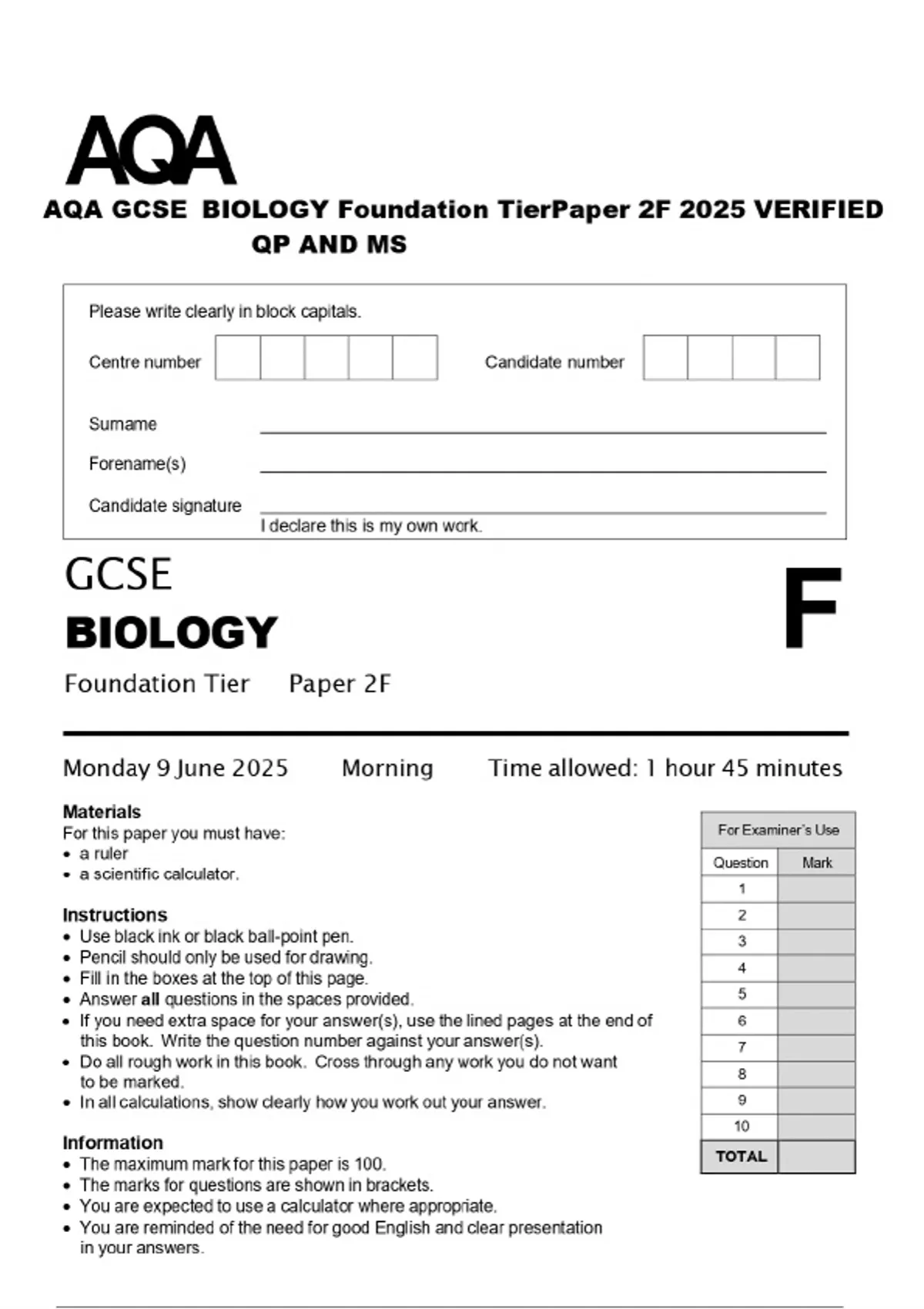 AQA GCSE BIOLOGY Foundation TierPaper 2F 2025 VERIFIED QP AND MS