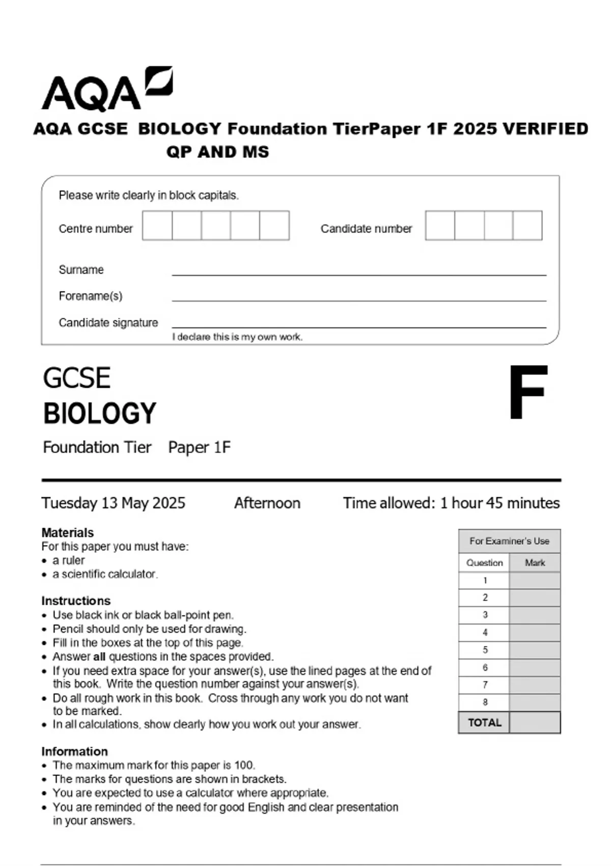AQA GCSE BIOLOGY Foundation TierPaper 1F 2025 VERIFIED QP AND MS
