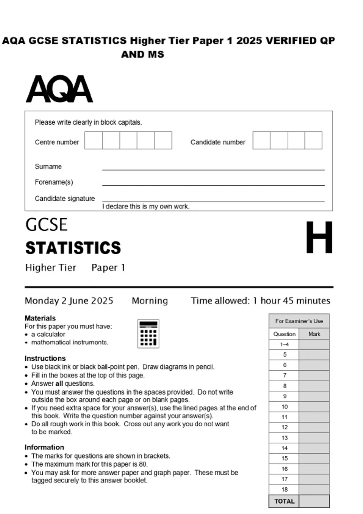 AQA GCSE STATISTICS Higher Tier Paper 1 2025 VERIFIED QP AND MS