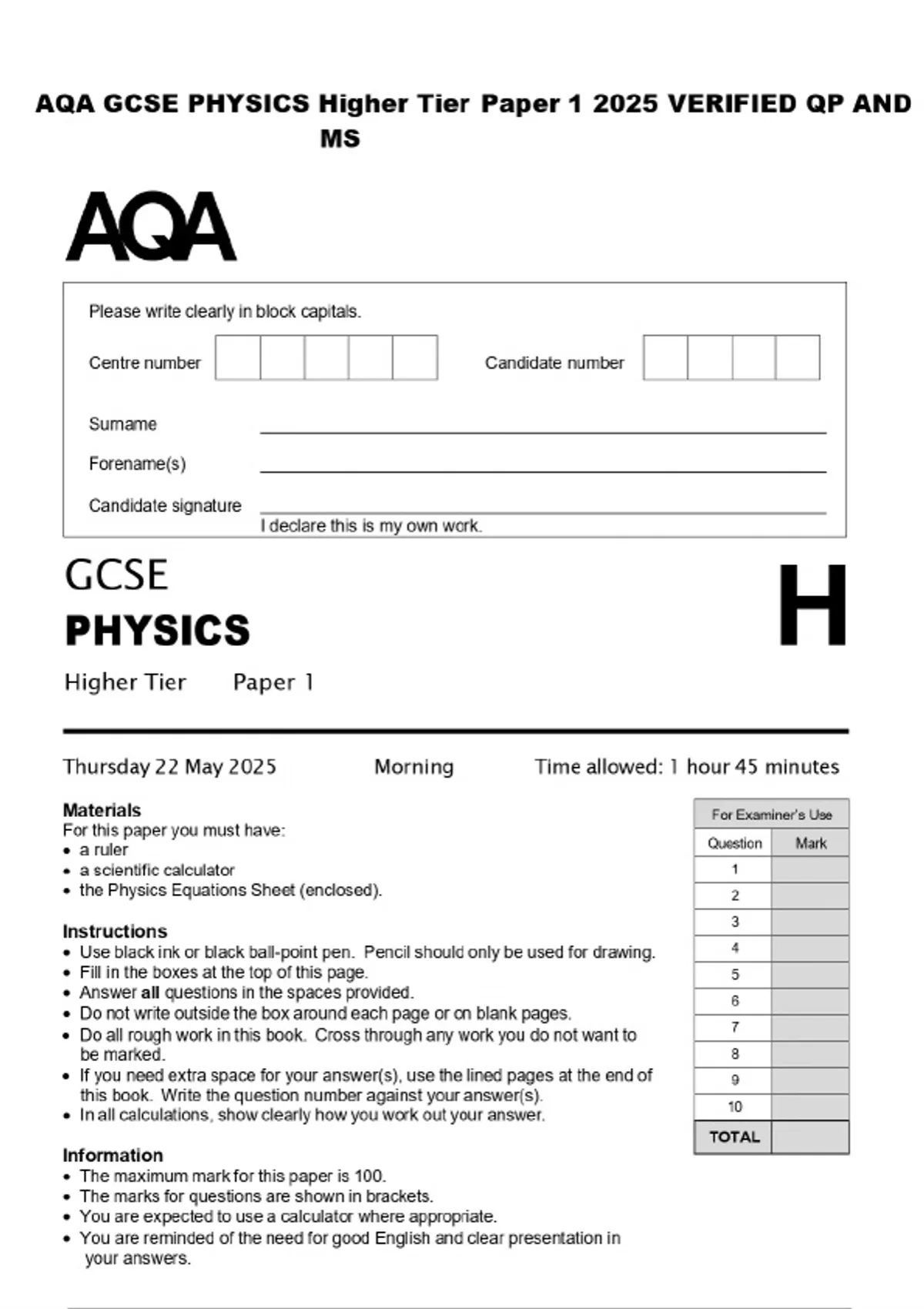 AQA GCSE PHYSICS Higher Tier Paper 1 2025 VERIFIED QP AND MS