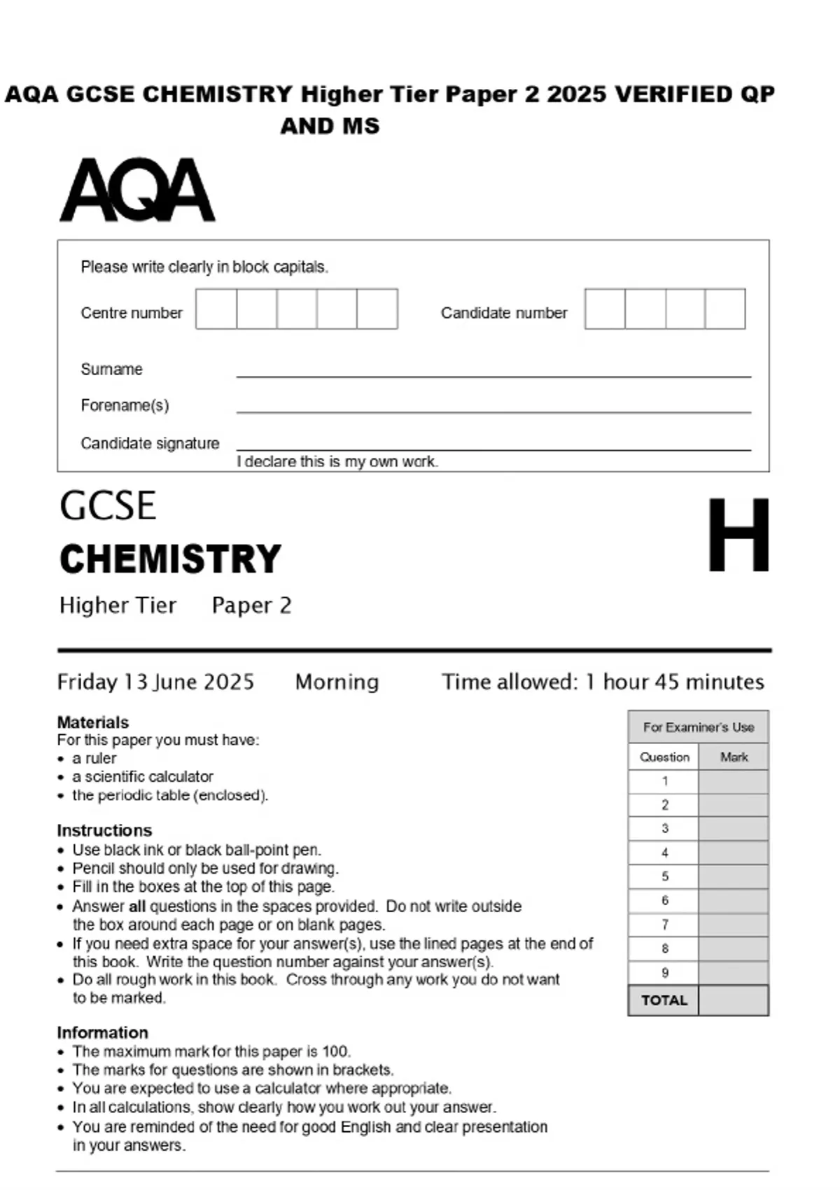 AQA GCSE CHEMISTRY Higher Tier Paper 2 2025 VERIFIED QP AND MS