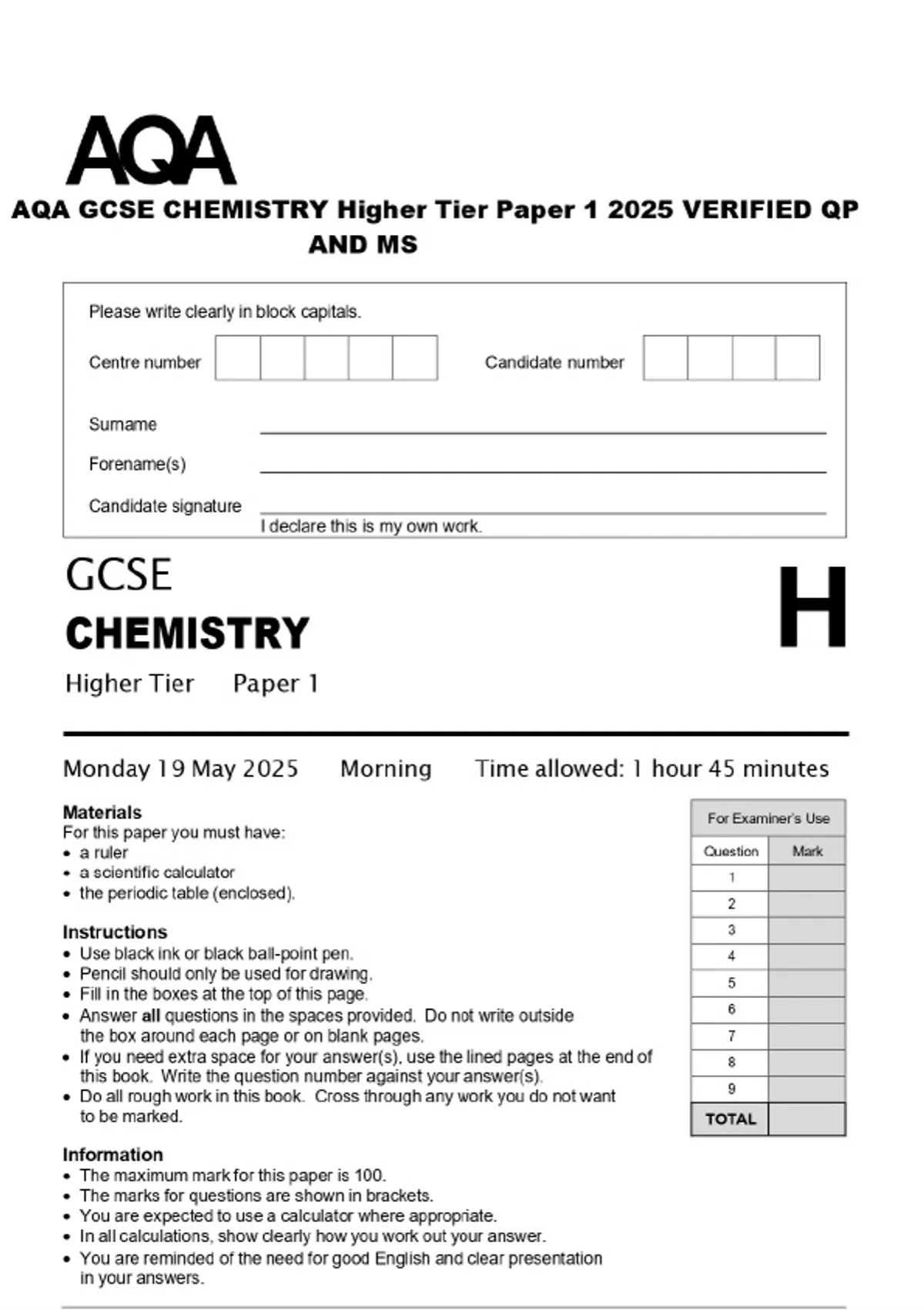 AQA GCSE CHEMISTRY Higher Tier Paper 1 2025 VERIFIED QP AND MS