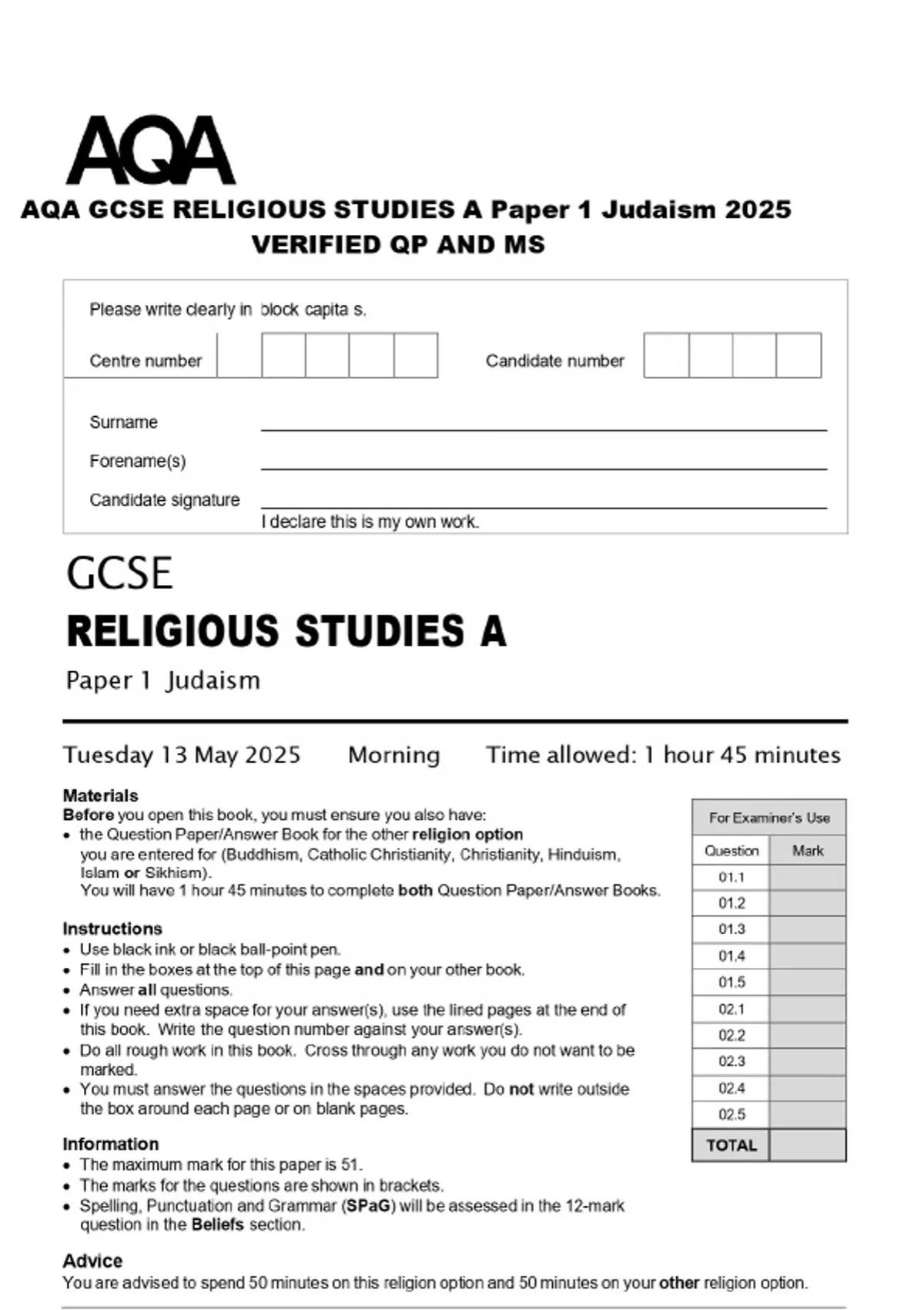 AQA GCSE RELIGIOUS STUDIES A Paper 1 Judaism 2025 VERIFIED QP AND MS