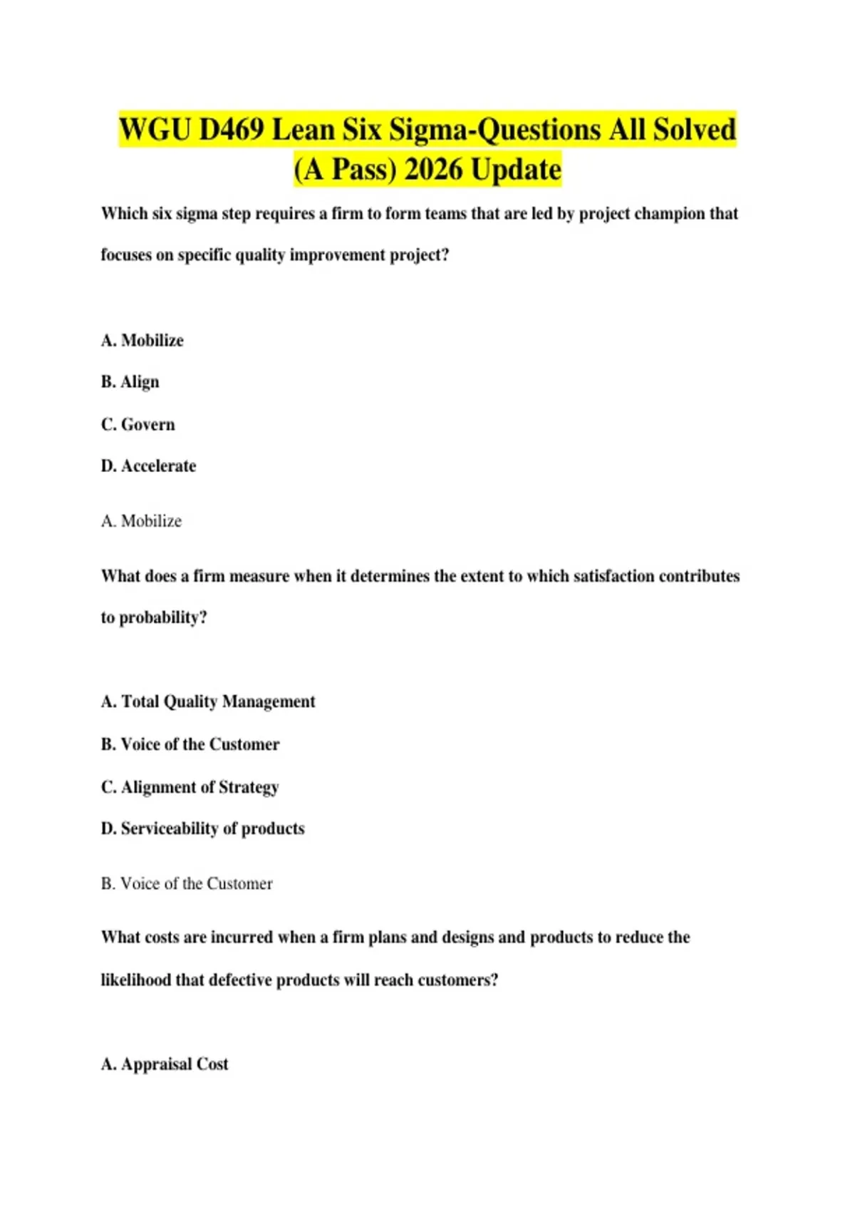 WGU D469 Lean Six Sigma-Questions All Solved (A Pass) 2026 Update