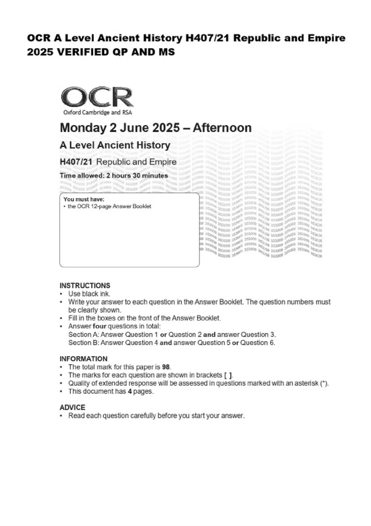 OCR A Level Ancient History H407/21 Republic and Empire 2025 VERIFIED QP AND MS