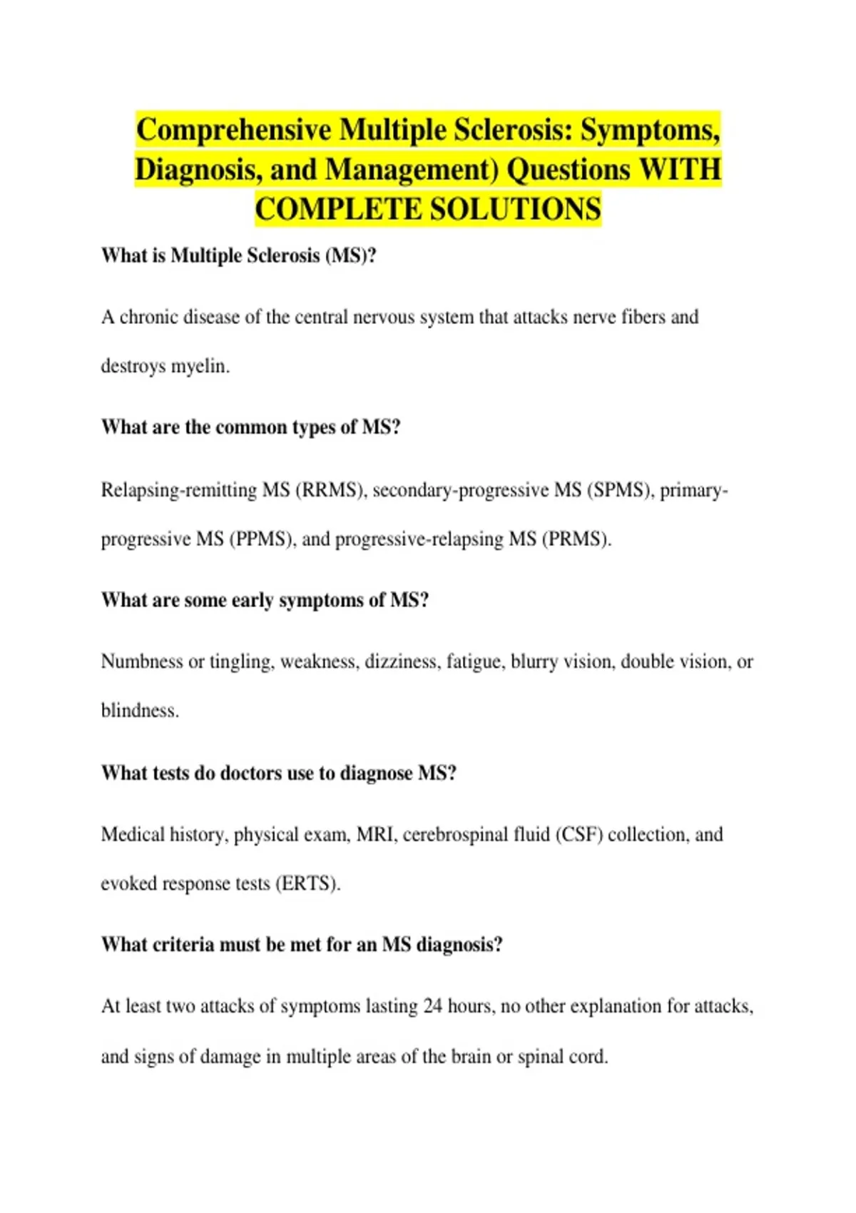 Comprehensive Multiple Sclerosis: Symptoms, Diagnosis, and Management) Questions WITH COMPLETE SOLUTIONS