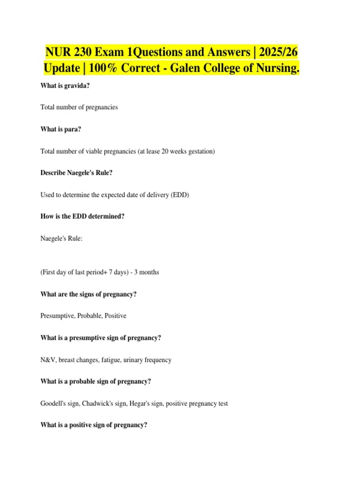 NUR 230 Exam 1Questions and Answers | 2025/26
