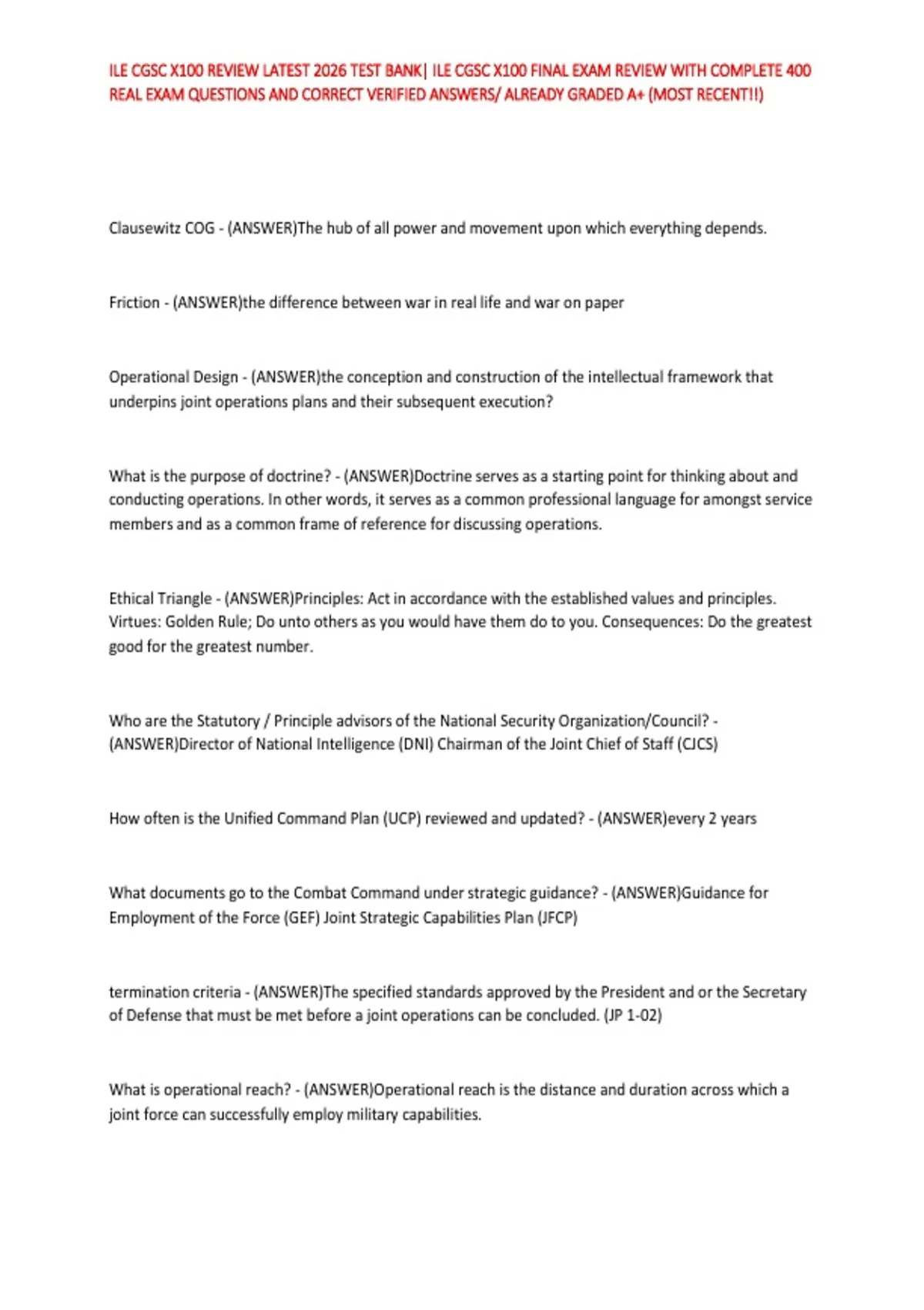 , ILE CGSC X100 REVIEW LATEST 2026 TEST BANK| ILE CGSC X100 FINAL EXAM REVIEW WITH COMPLETE 400