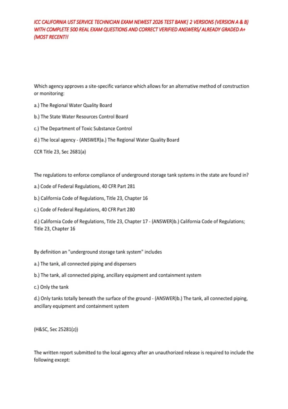 , ICC CALIFORNIA UST SERVICE TECHNICIAN EXAM NEWEST 2026 TEST BANK| 2 VERSIONS (VERSION A & B)