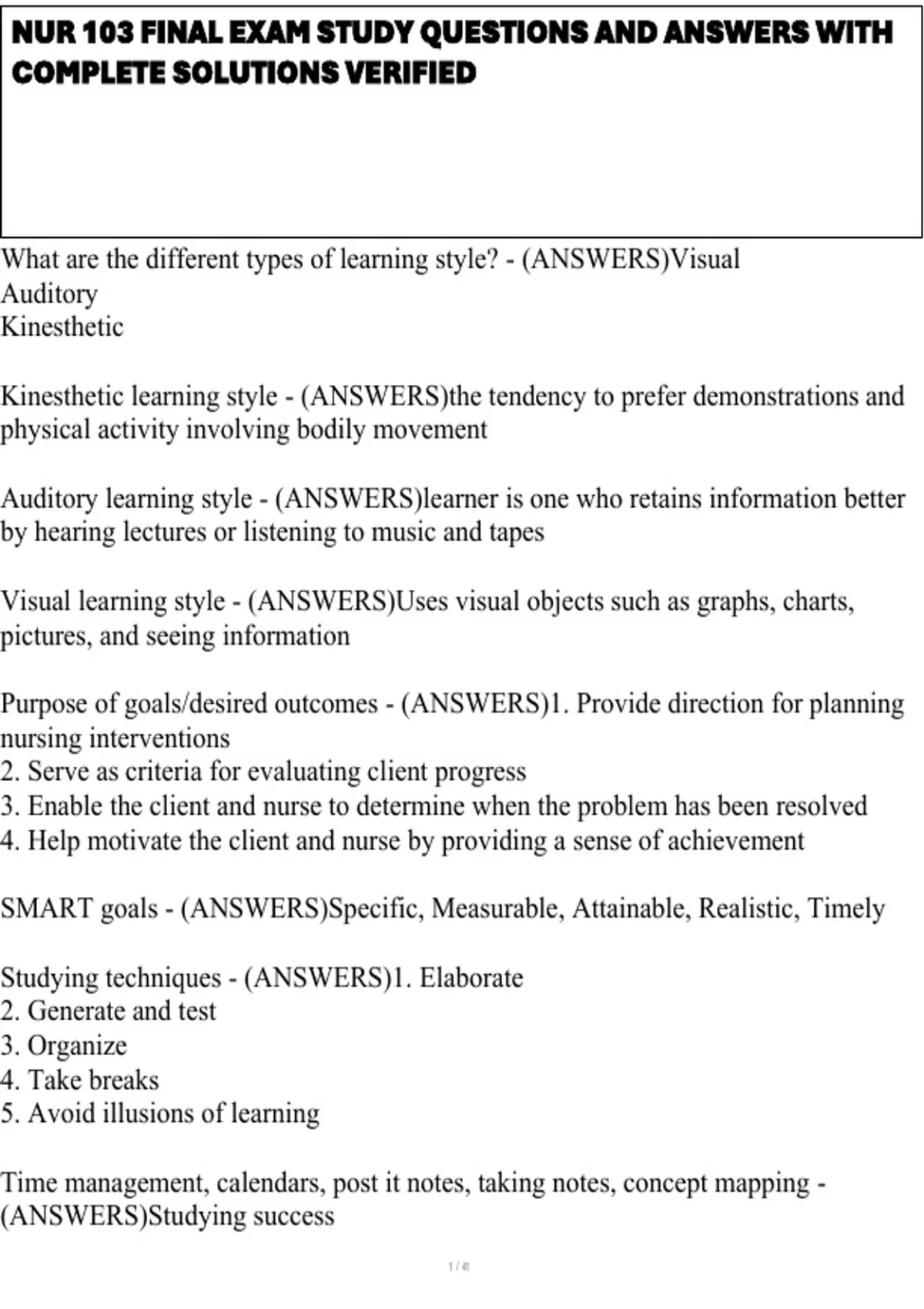 NUR 103 FINAL EXAM STUDY QUESTIONS AND ANSWERS WITH