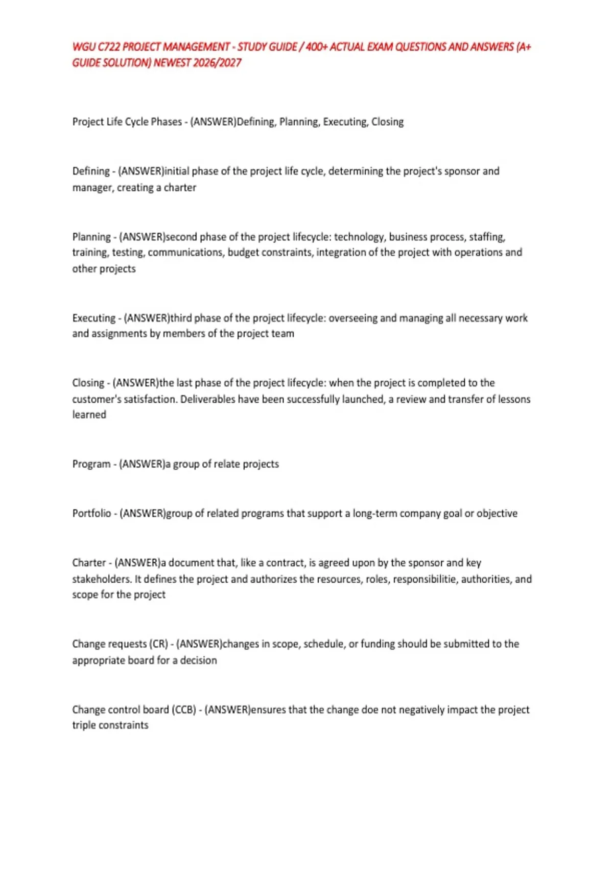 , WGU C722 PROJECT MANAGEMENT - STUDY GUIDE / 400+ ACTUAL EXAM QUESTIONS AND ANSWERS (A+