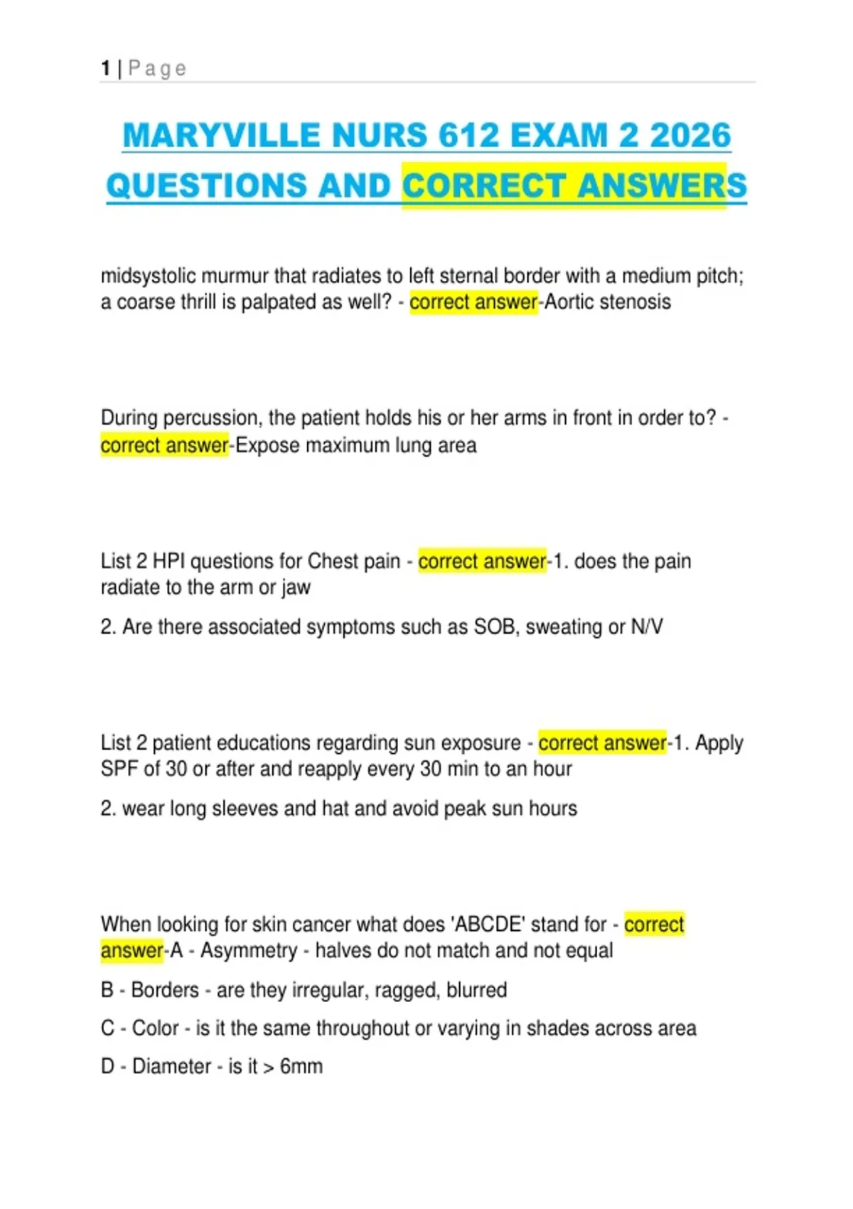 MARYVILLE NURS 612 EXAM 2 2026 QUESTIONS AND CORRECT ANSWERS