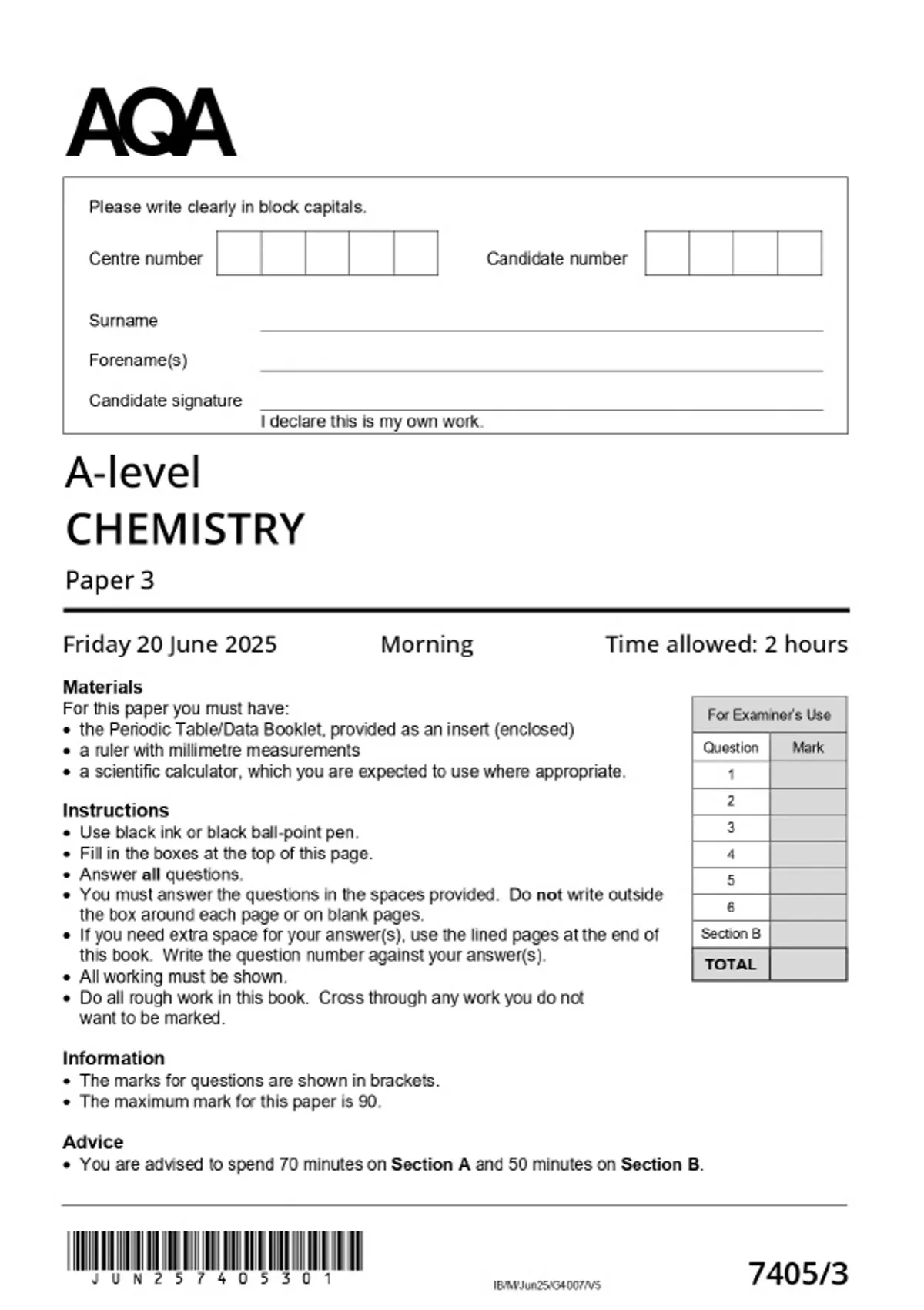 AQA 2025 Chemistry A-level 7405/3 Paper 3 MERGED QUESTION PAPER & MARKSCHEME