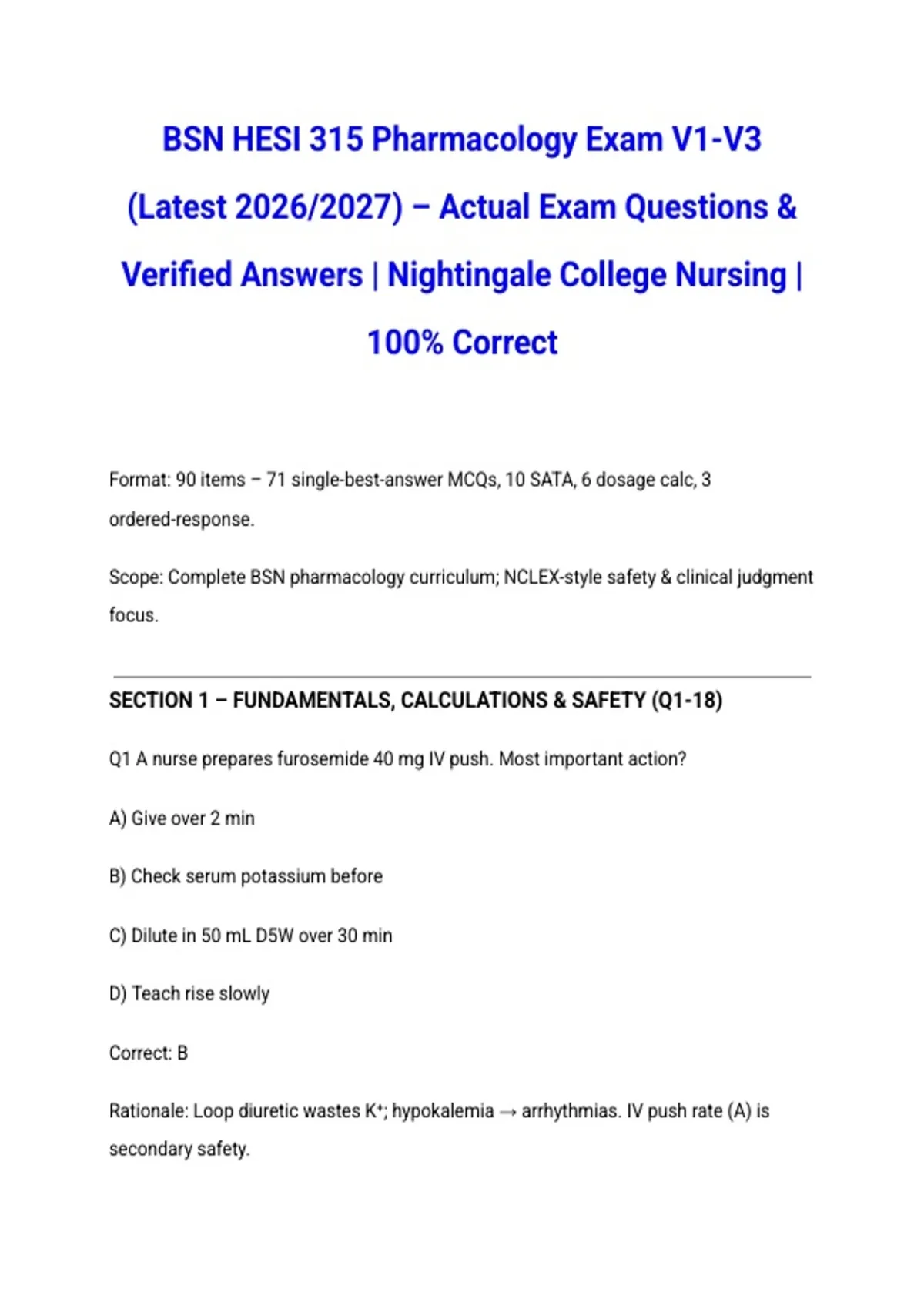Q1 A nurse prepares furosemide 40 mg IV push. Most important action?