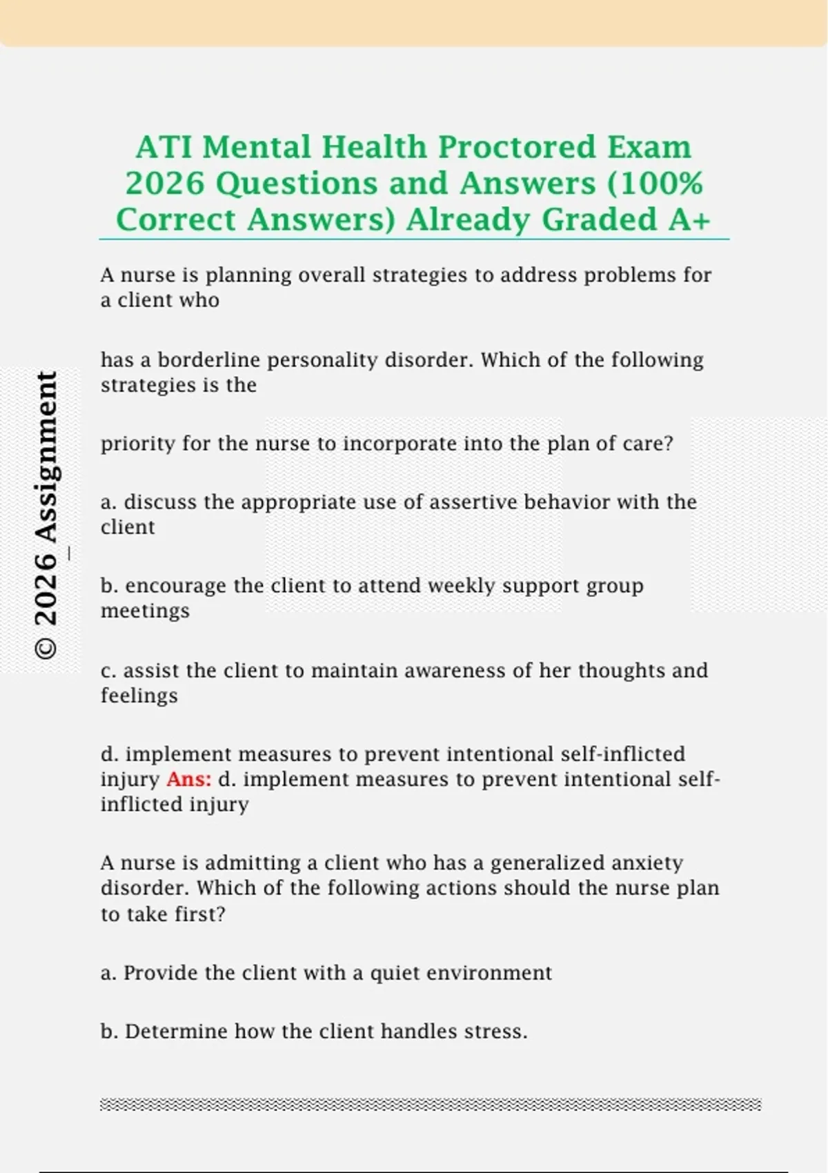 ATI Mental Health Proctored Exam 2026 Questions and Answers (100% Correct Answers) Already Graded A+
