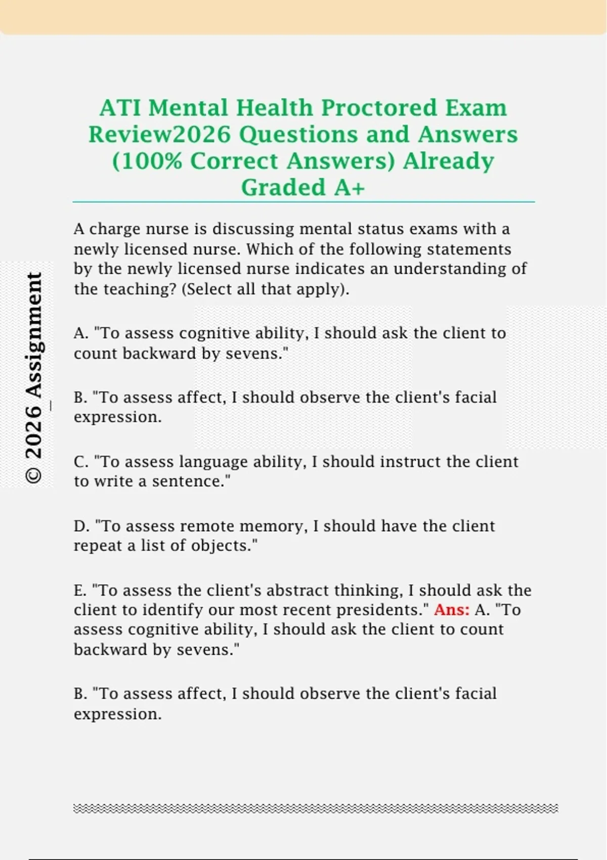 ATI Mental Health Proctored Exam Review2026 Questions and Answers (100% Correct Answers) Already Graded A+