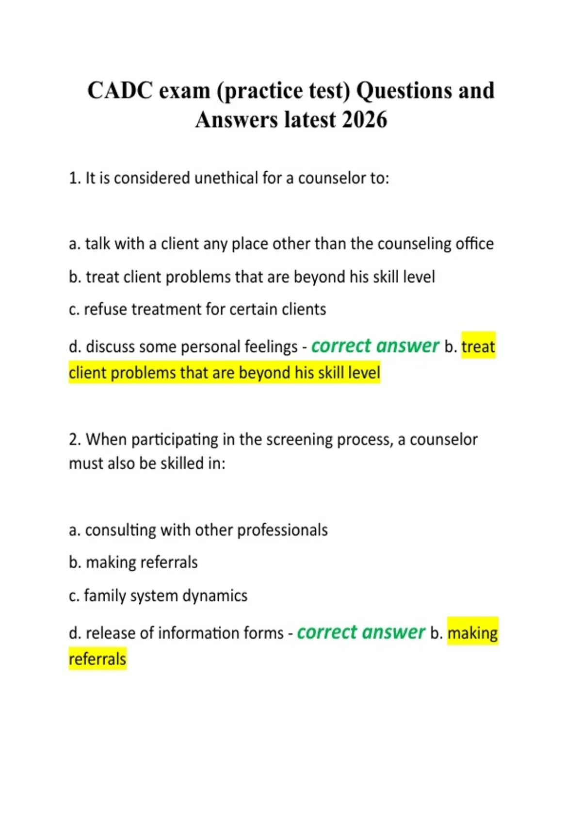 : This document includes up-to-date CADC exam practice test questions with accurate and clearly explained answers for the 2026 exam cycle. It covers core CADC domains such as substance use disorders, counseling techniques, ethics, screening and assessment, treatment planning, and professional responsibilities, making it suitable for focused exam preparation and self-testing.