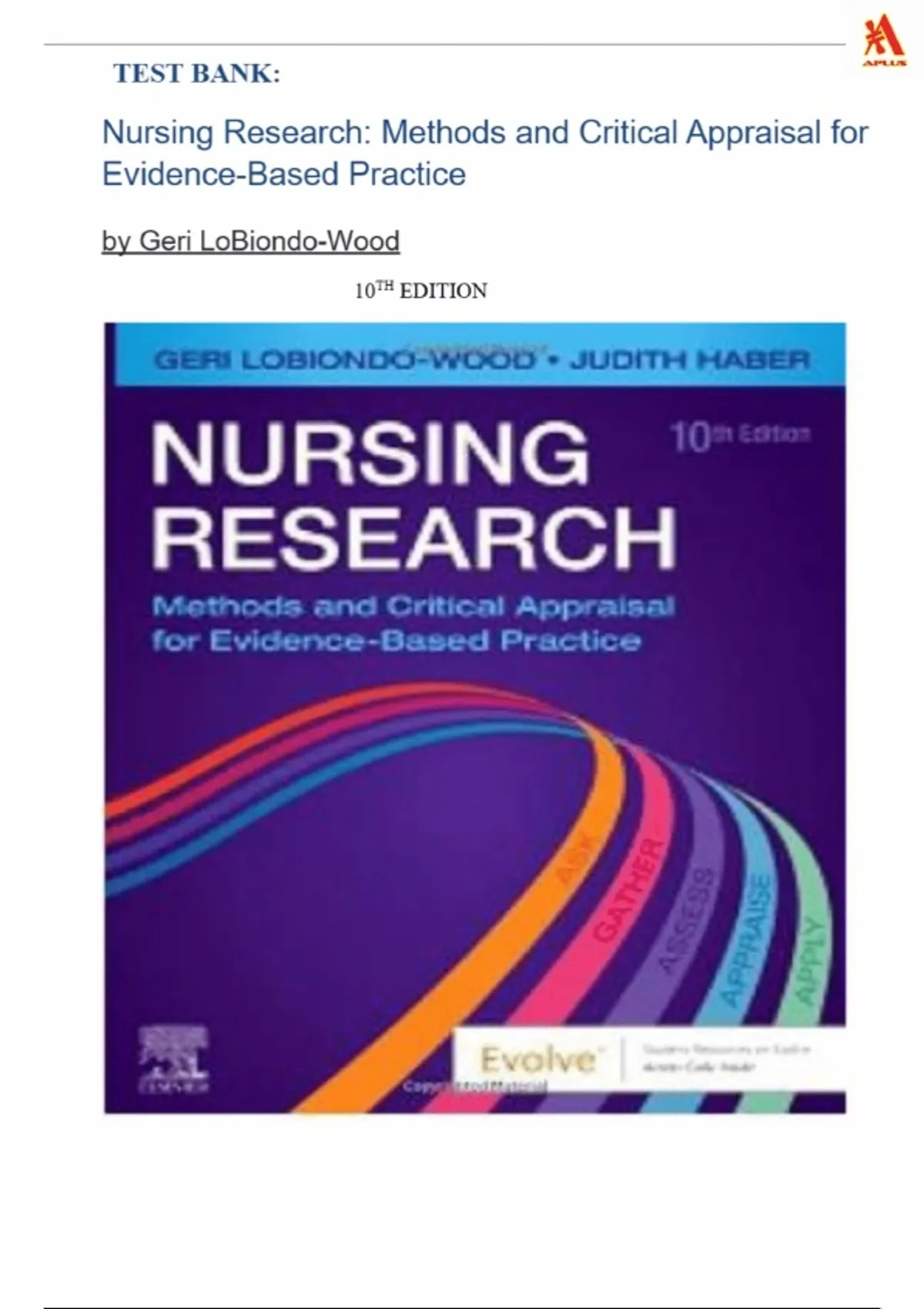 Test Bank for Nursing Research Methods and Critical Appraisal for Evidence Based Practice 10th Edition by Geri Lobiondo Wood.||All chapters 1-21 included.||Complete test guide.|Graded A+.