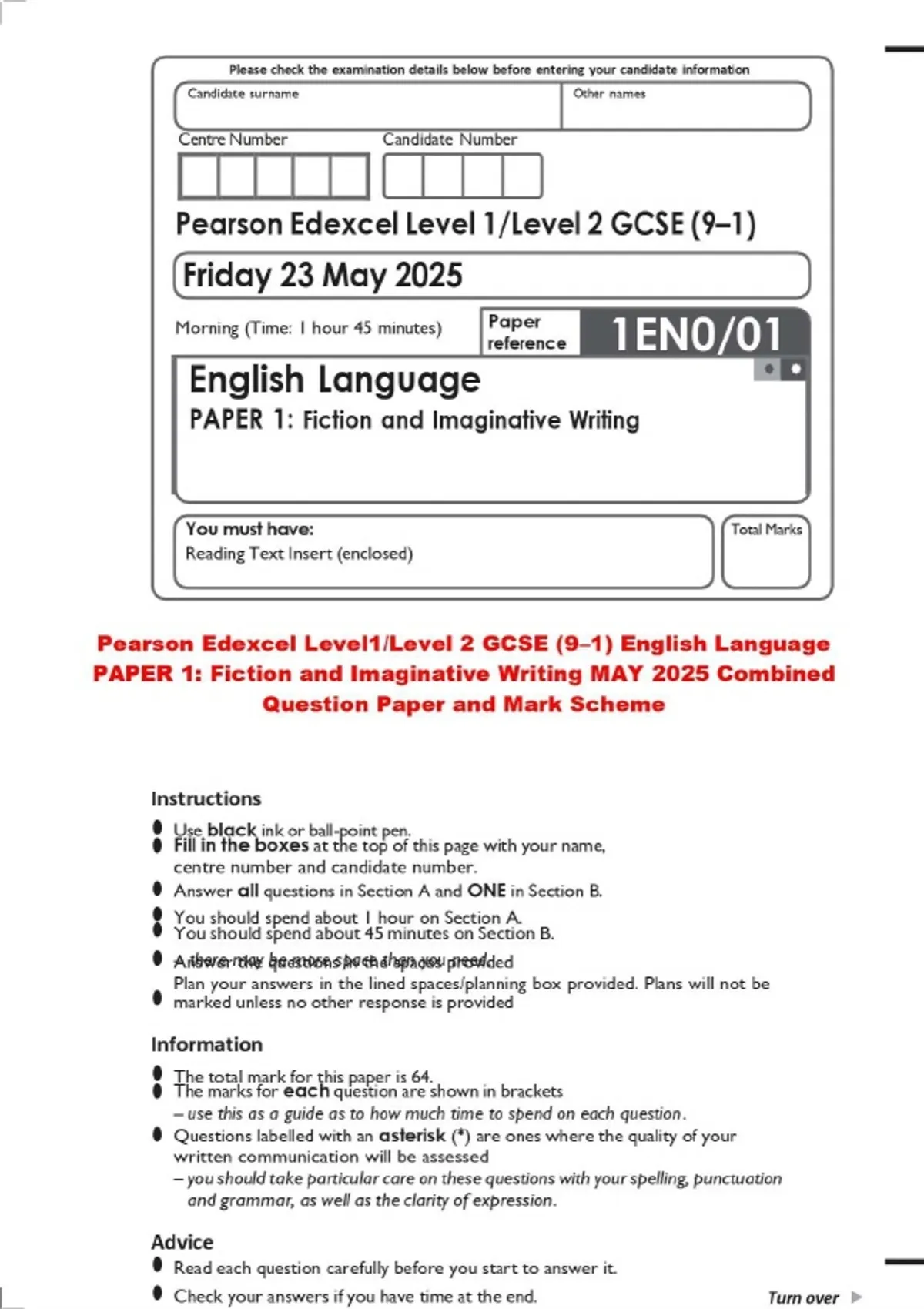 Pearson Edexcel Level1/Level 2 GCSE (9–1) English Language PAPER 1: Fiction and Imaginative Writing MAY 2025 Combined Question Paper and Mark Scheme