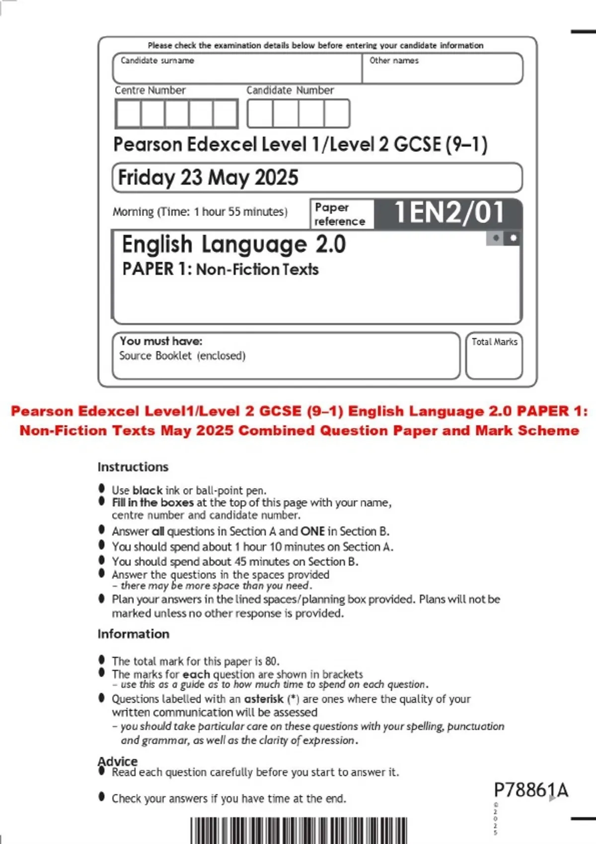 Pearson Edexcel Level1/Level 2 GCSE (9–1) English Language 2.0 PAPER 1: Non-Fiction Texts May 2025 Combined Question Paper and Mark Scheme